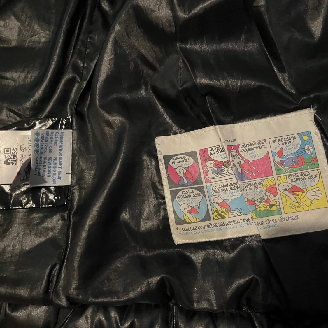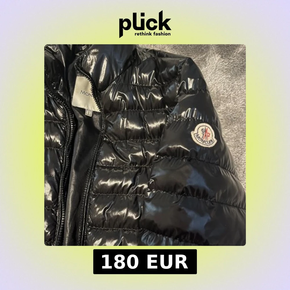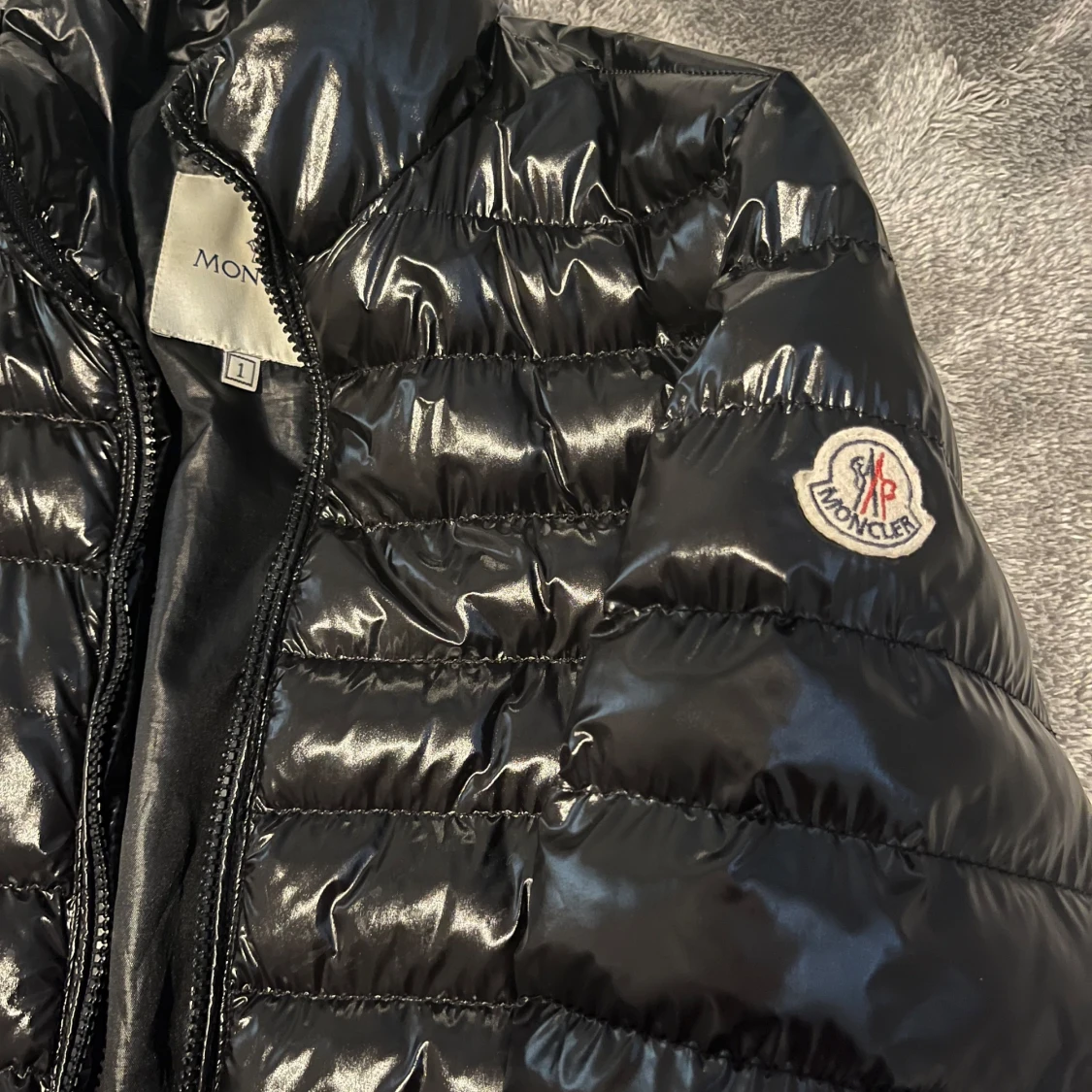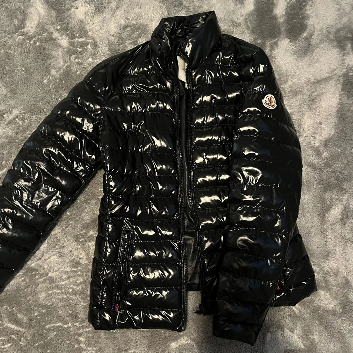 Säljer en snygg svart pufferjacka från Moncler med glansig finish. Jackan har en dragkedja framtill och Moncler-logga på ärmen. Perfekt för kyligare dagar med sin quiltade design.