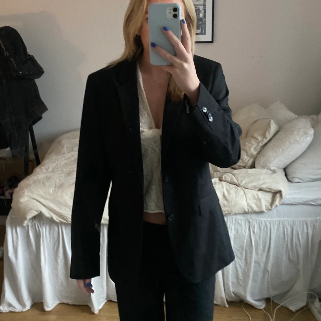 Svart vintage kavajđ€ Storlek 48 i herr, lagom oversized pĂ„ mig som vantligtvis bĂ€r storlek S