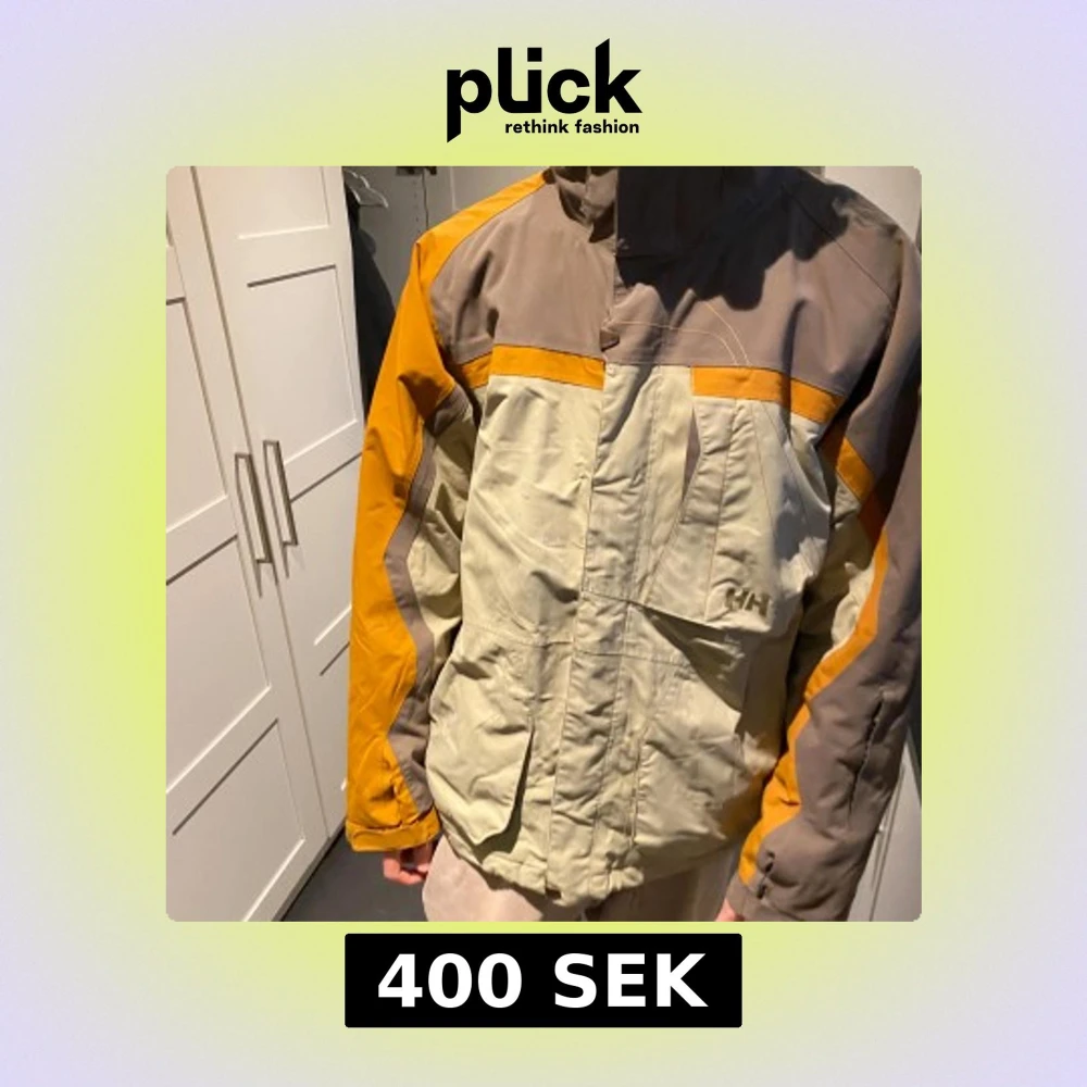 Säljer en flerfärgad jacka från Helly Hansen med dragkedja och hög krage. Jackan har en kombination av beige, brun och orange färgblockdesign. Perfekt för utomhusaktiviteter med praktiska fickor och justerbara ärmslut.