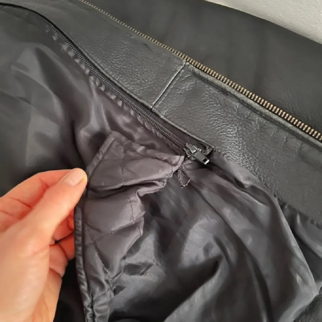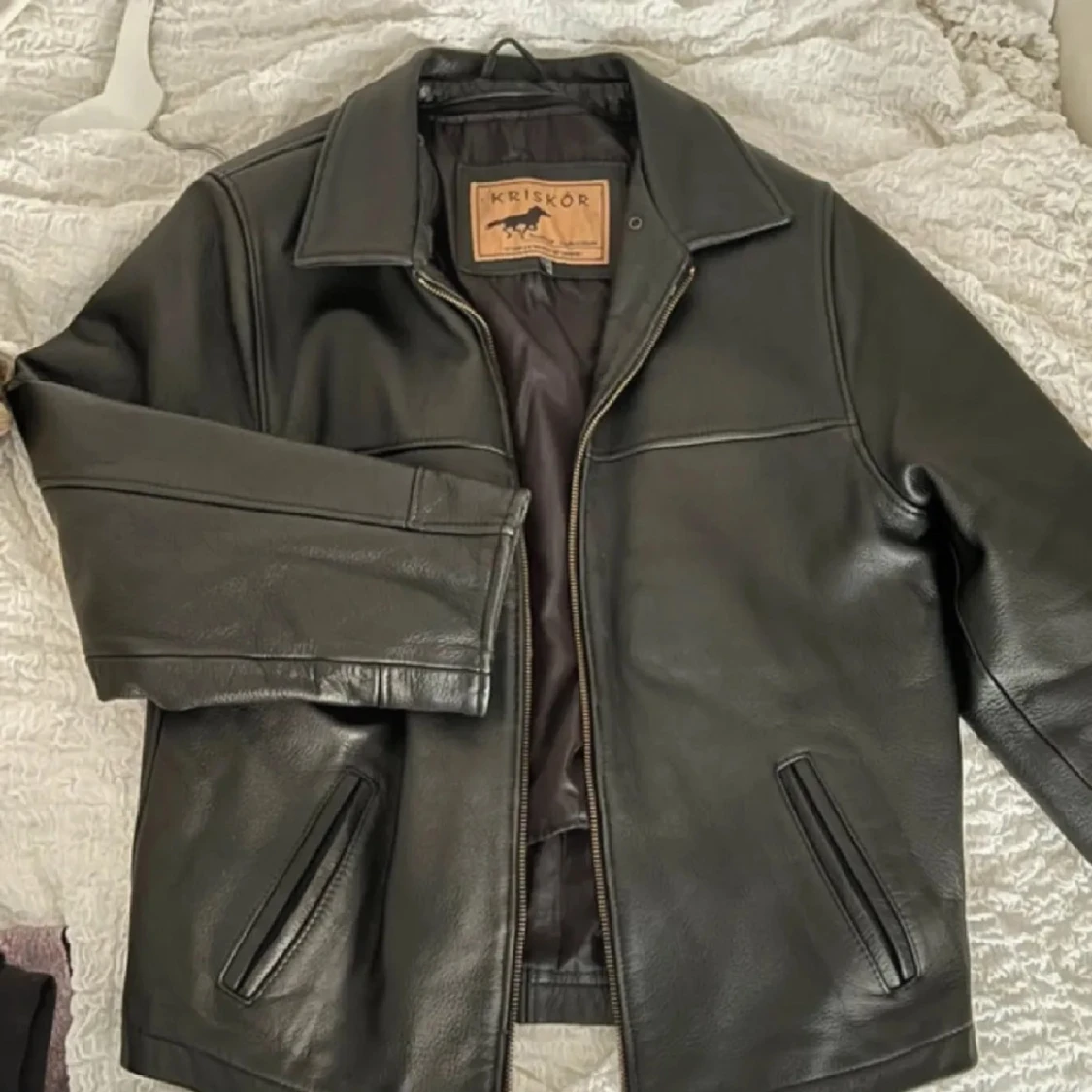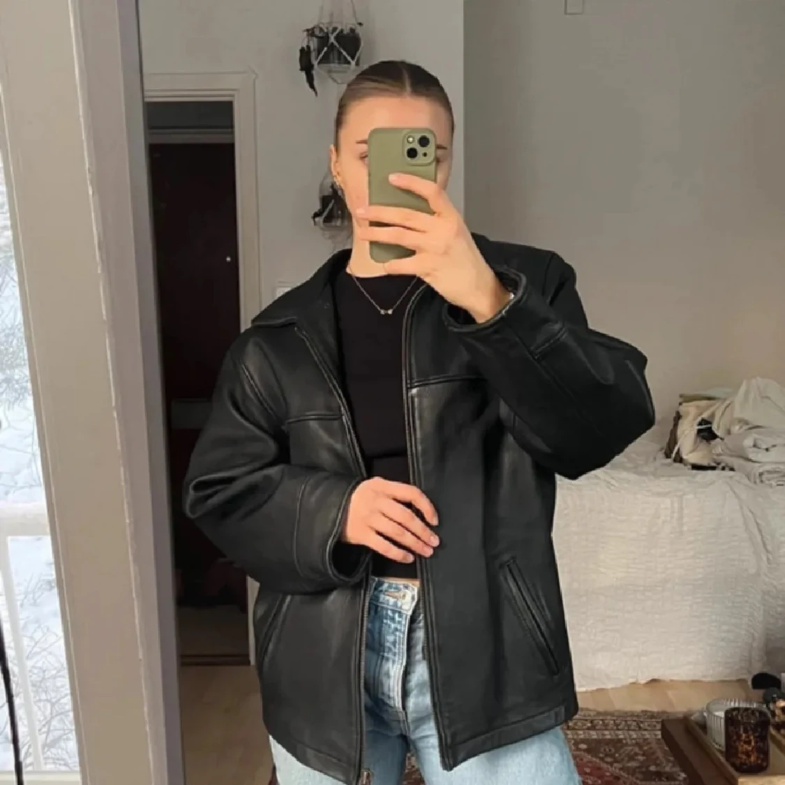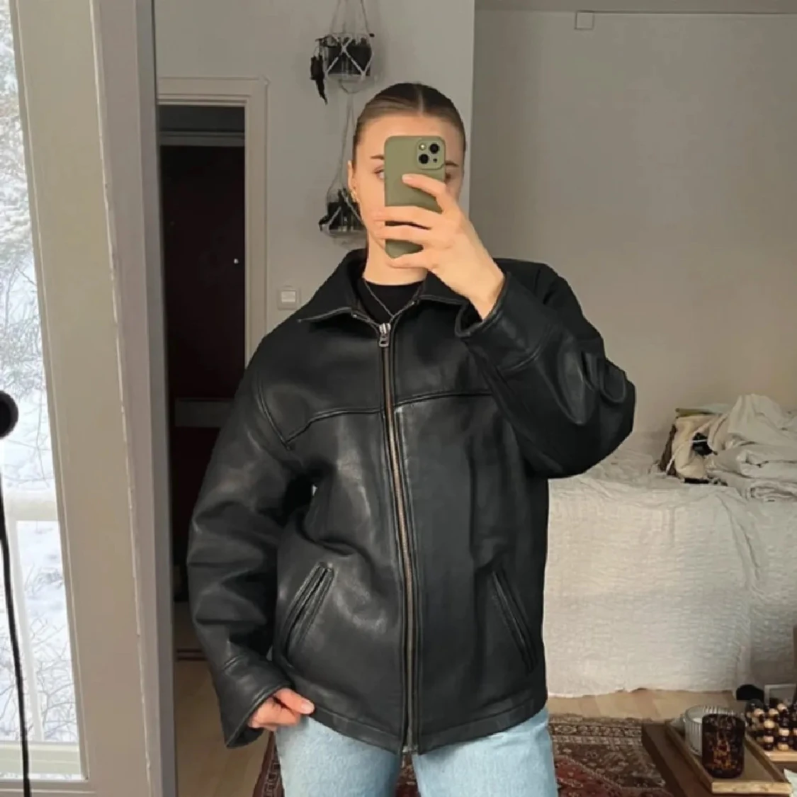 Säljer denna jättefina vintage skinnjackan<3 100% äkta läder, den är fodrad med avtagbart foder så kan göras varmare för höst/vinter och även svalare till våren! <3 Herrstl M och sitter oversize på mig som vanligtvis är S/M! <3