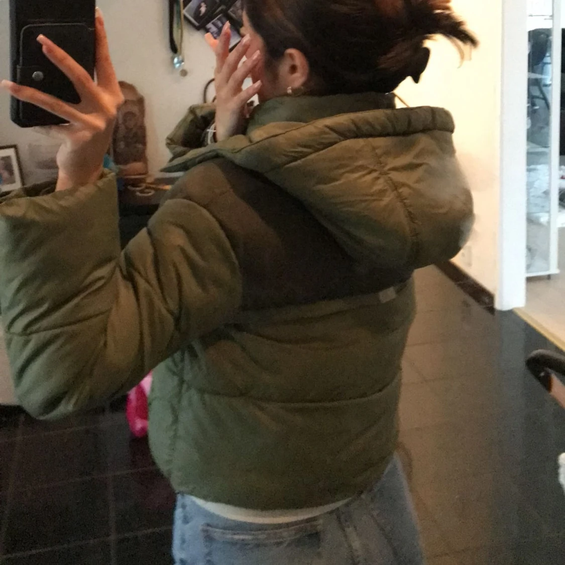 Grön vinter jacka med luva har använt den minst 4ggr. Den har fikor och är väldigt bekväm