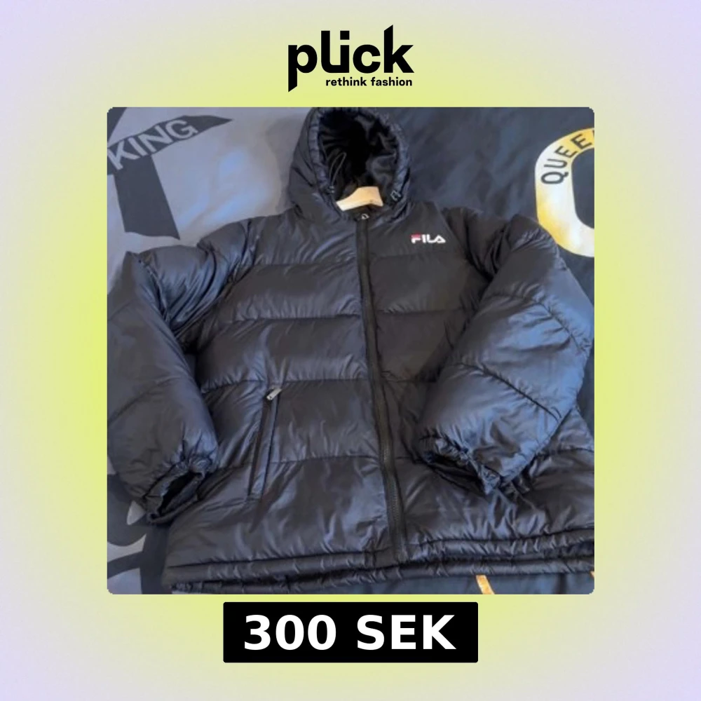 Säljer en svart pufferjacka från FILA med huva och dragkedja. Jackan har en stor logga på ryggen och mindre logga på bröstet. Perfekt för kalla dagar med sin vadderade design och långa ärmar.
