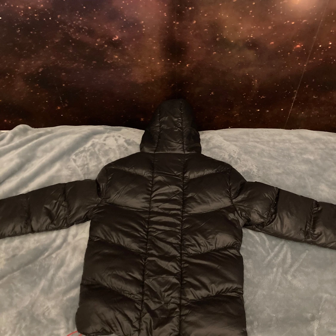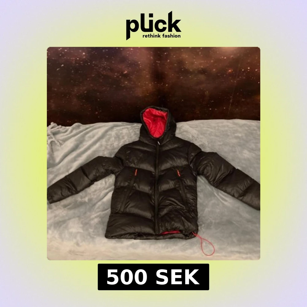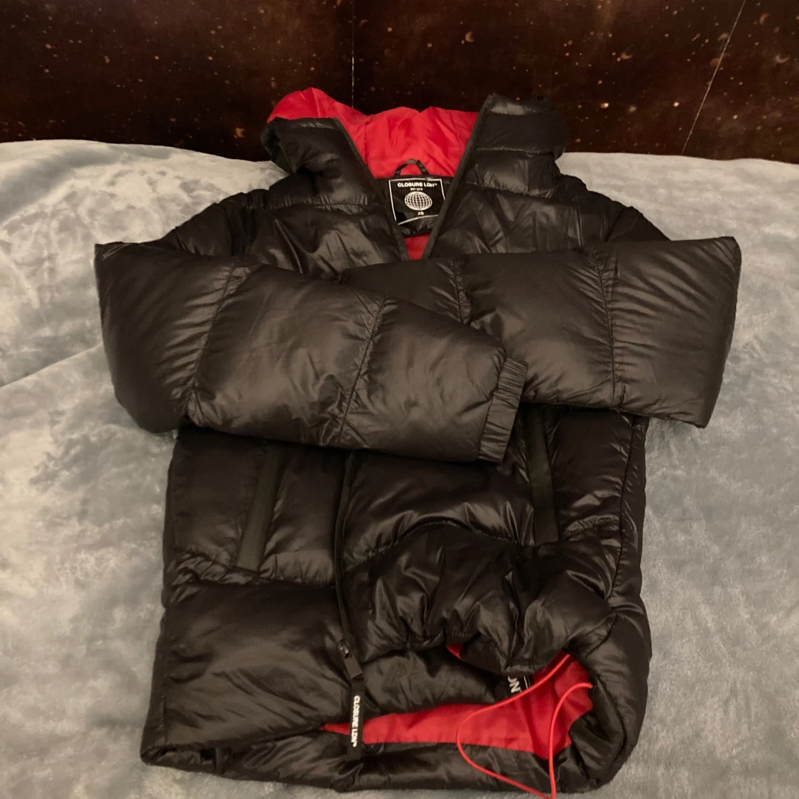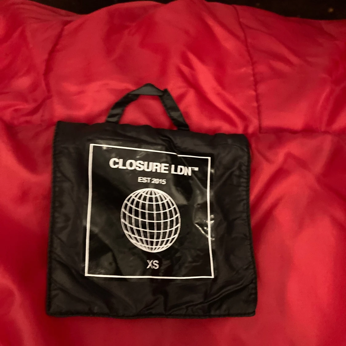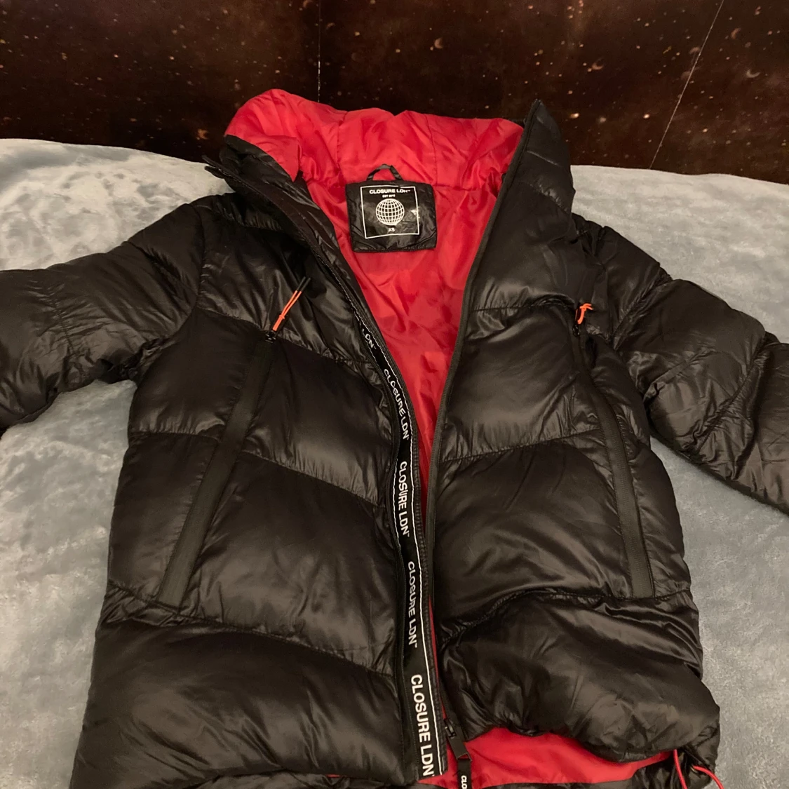 Säljer en snygg svart dunjacka från Closure LDN med röd insida. Jackan har en praktisk dragkedja och långa ärmar. Perfekt för kyliga dagar med sin pufferdesign och huva. Använd endast ett fåtal gånger: