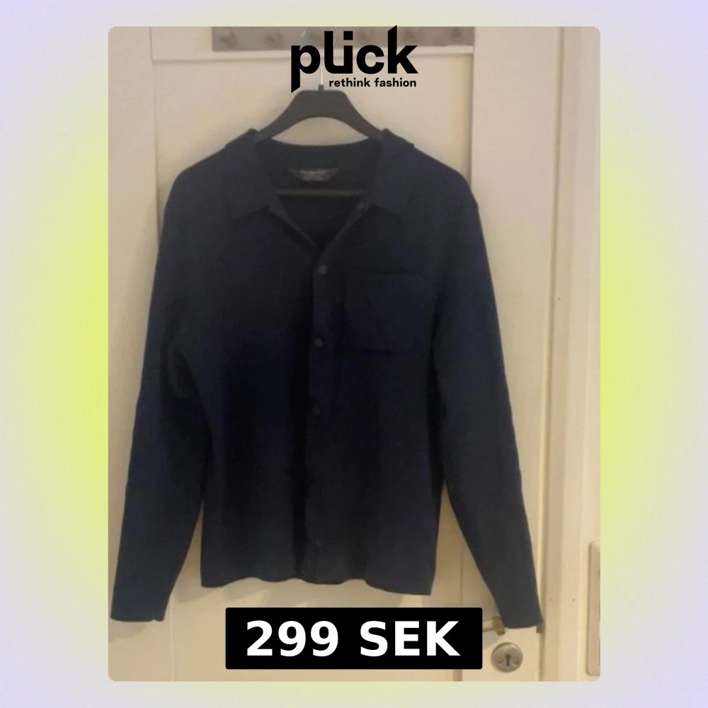 Säljer en stilren mörkblå overshirt. Jackan har klassisk krage, knappstängning framtill och en bröstficka. Perfekt att slänga över en t-shirt för en clean look. Långärmad och i mjukt material. Storlek xs men passar som S