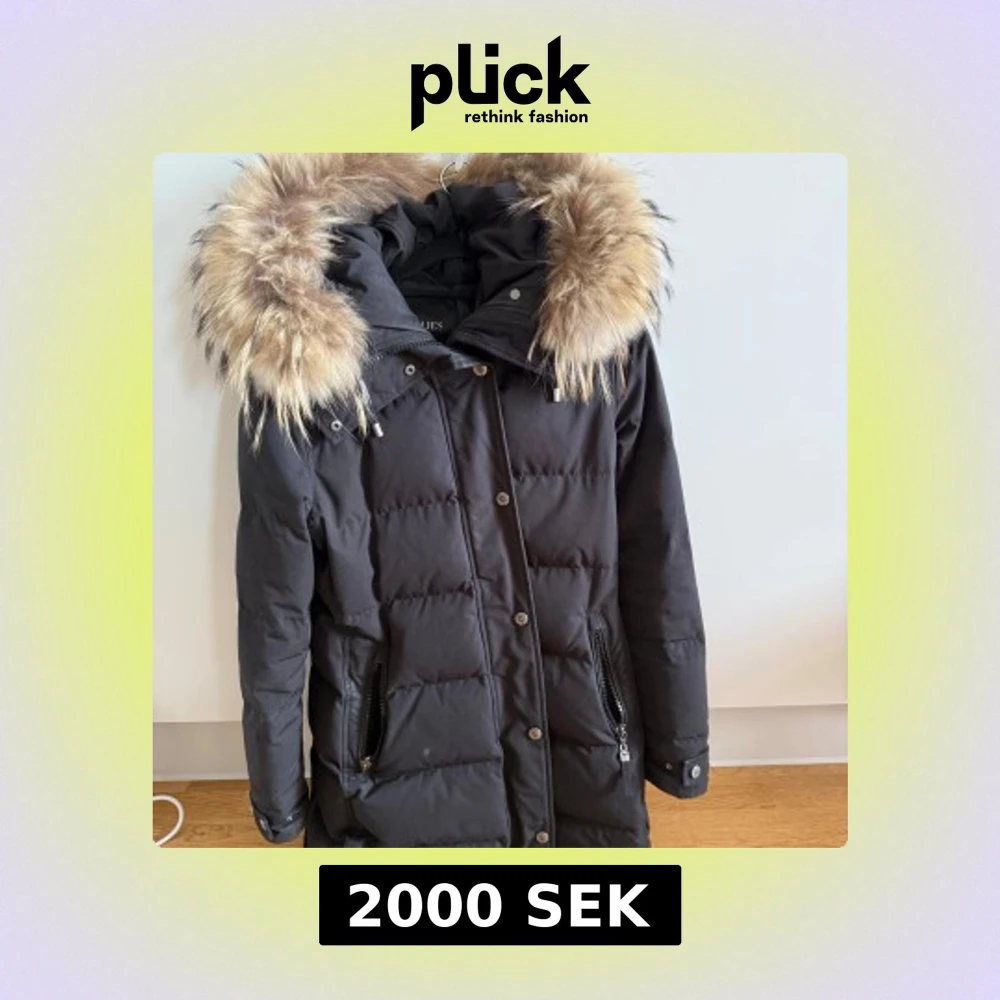 Snygg svart dunjacka med stor pälskantad huva. Jackan har dragkedja och knappar framtill samt praktiska fickor med dragkedja. Perfekt för kalla vinterdagar.