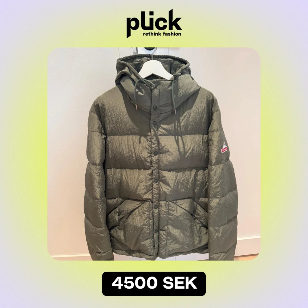 Säljer en grön dunjacka från Holubar med huva och broderad logga på ärmen. Jackan har en quiltad design och stängs med dragkedja och knappar. Perfekt för kyliga dagar. Endast använd ett fåtal gånger. Nypris 6700 kr