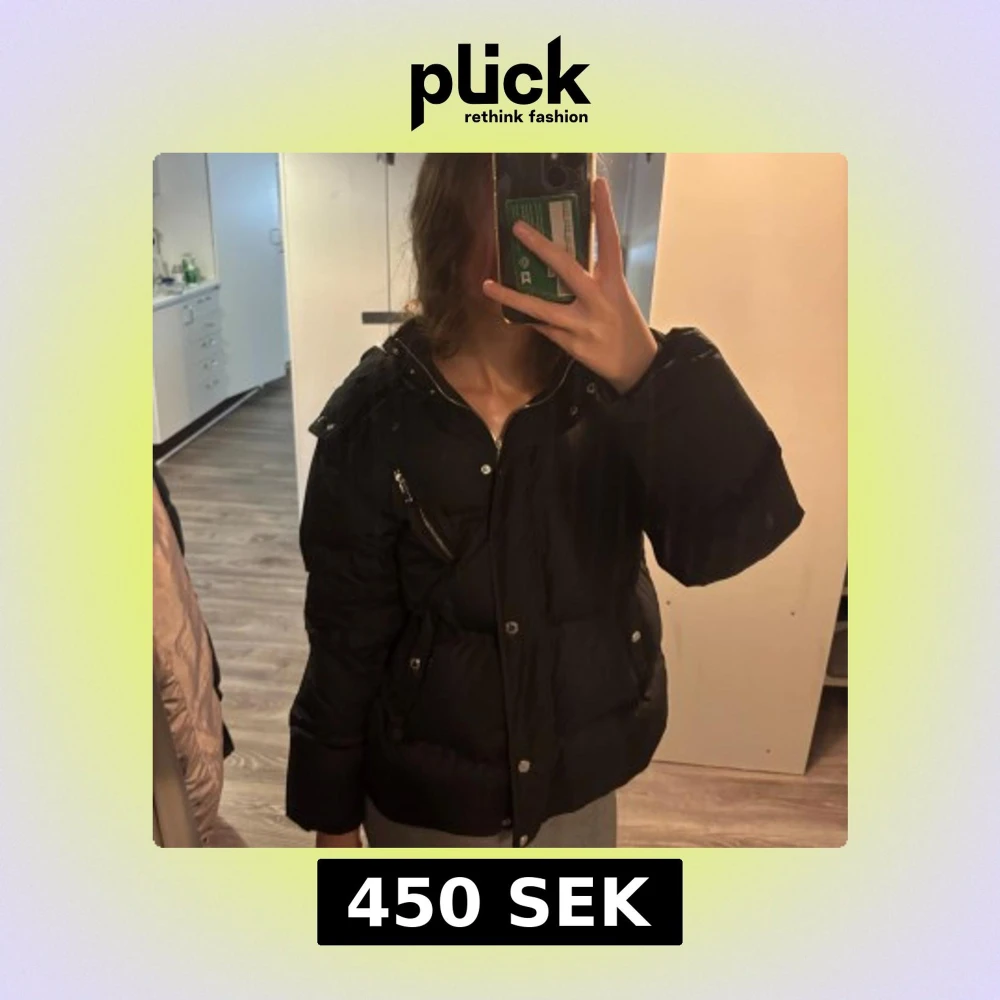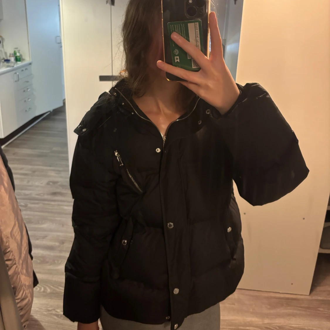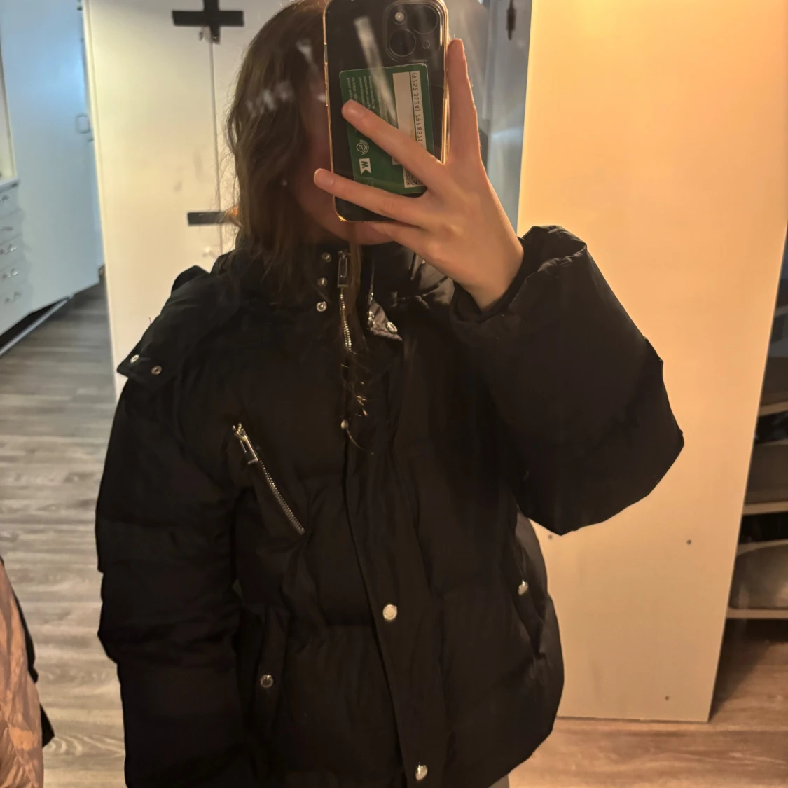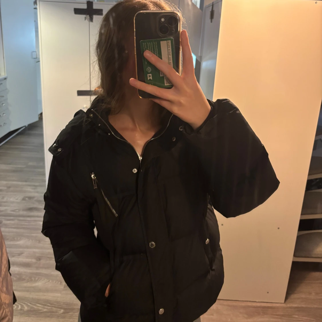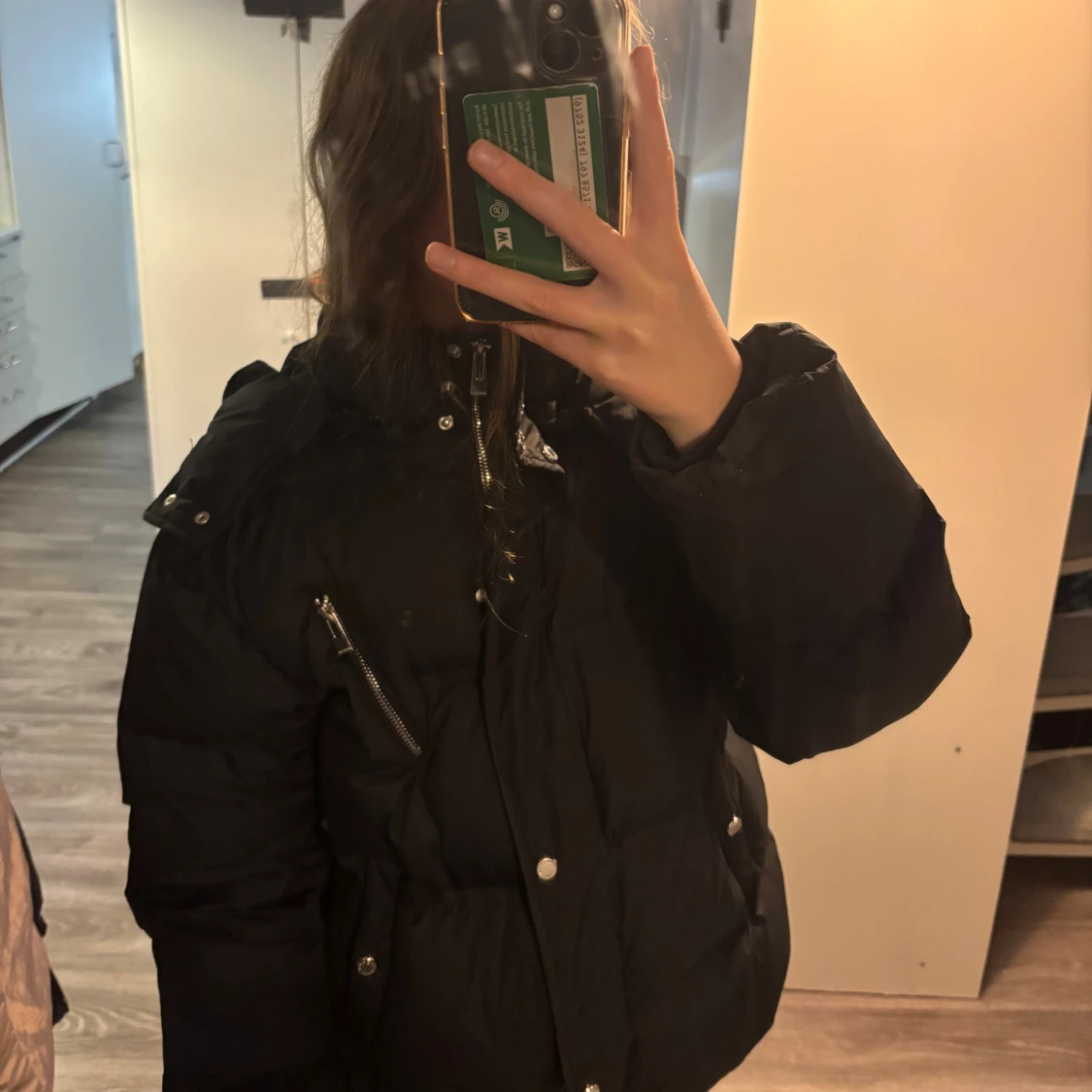 Säljer en svart pufferjacka med hög krage och huva. Jackan har en snygg dragkedja på bröstet, knappar framtill och stora fickor. Perfekt för kalla dagar och riktigt skön att bära!