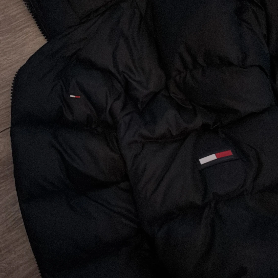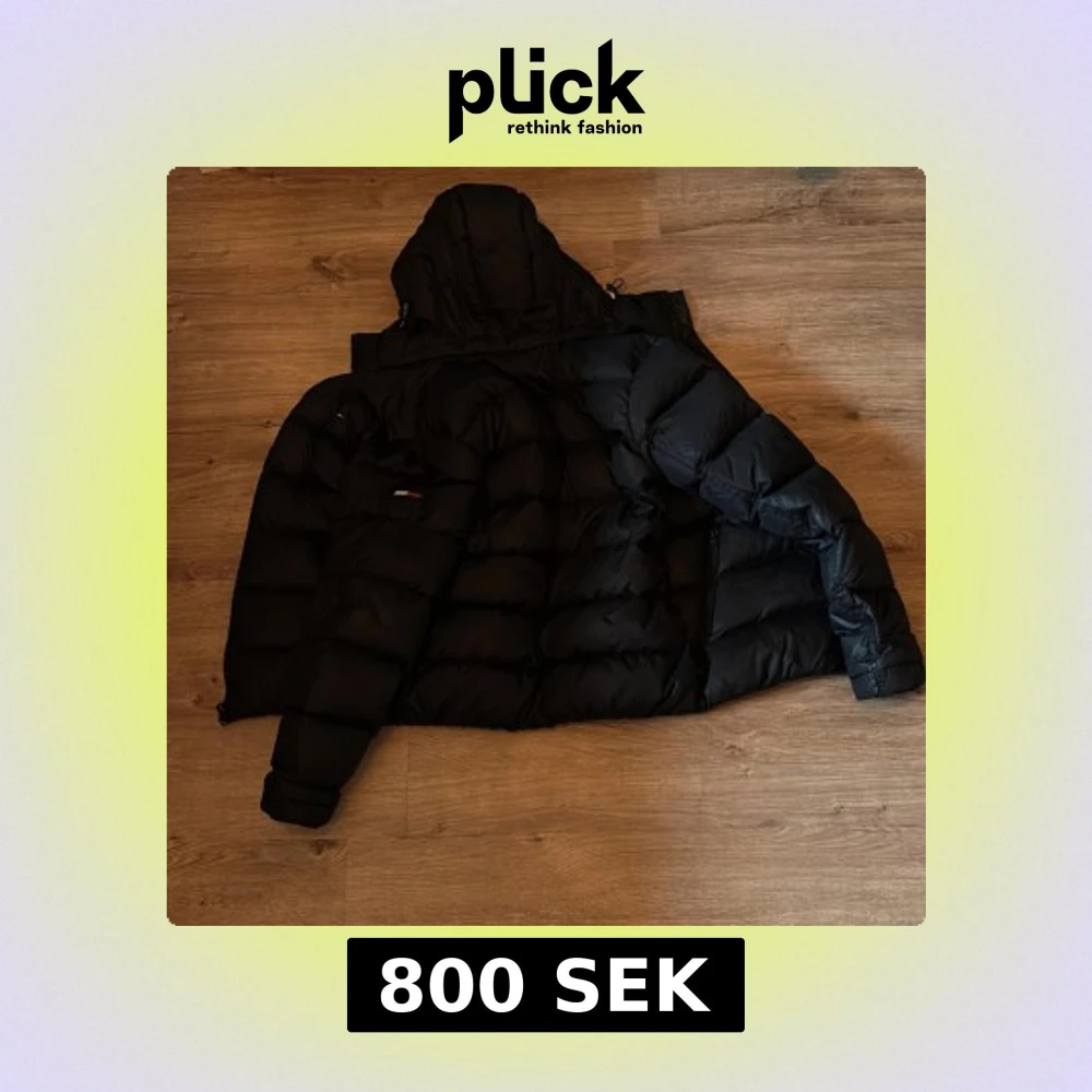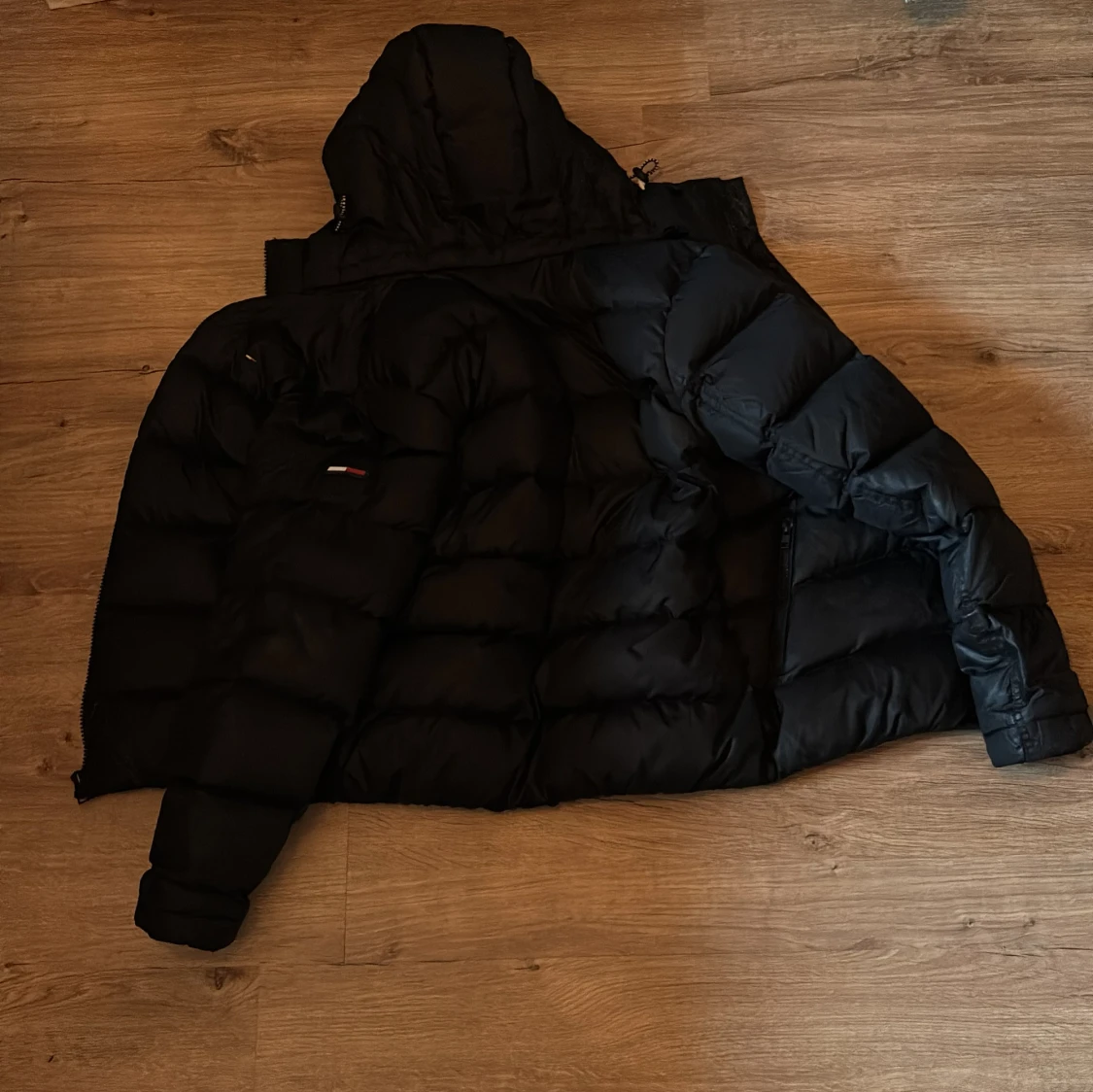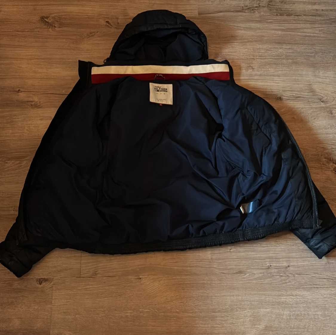 Säljer en marinblå dunjacka från Tommy Hilfiger med huva och dragkedja. Jackan har en klassisk märkeslogga på bröstet men även på vänstra armen. Perfekt för kyliga dagar. Luvan är avtagbar och jackan har inga synliga difekter eller andra difekter.