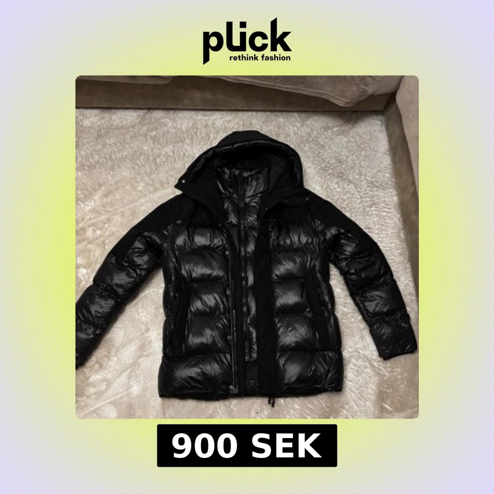 Säljer en svart pufferjacka från ZAVETTI CANADA med glansig finish och huva. Jackan har flera dragkedjor, praktiska fickor och quiltad design. Perfekt för kalla dagar och har en cool look med tydliga paneler och detaljer.