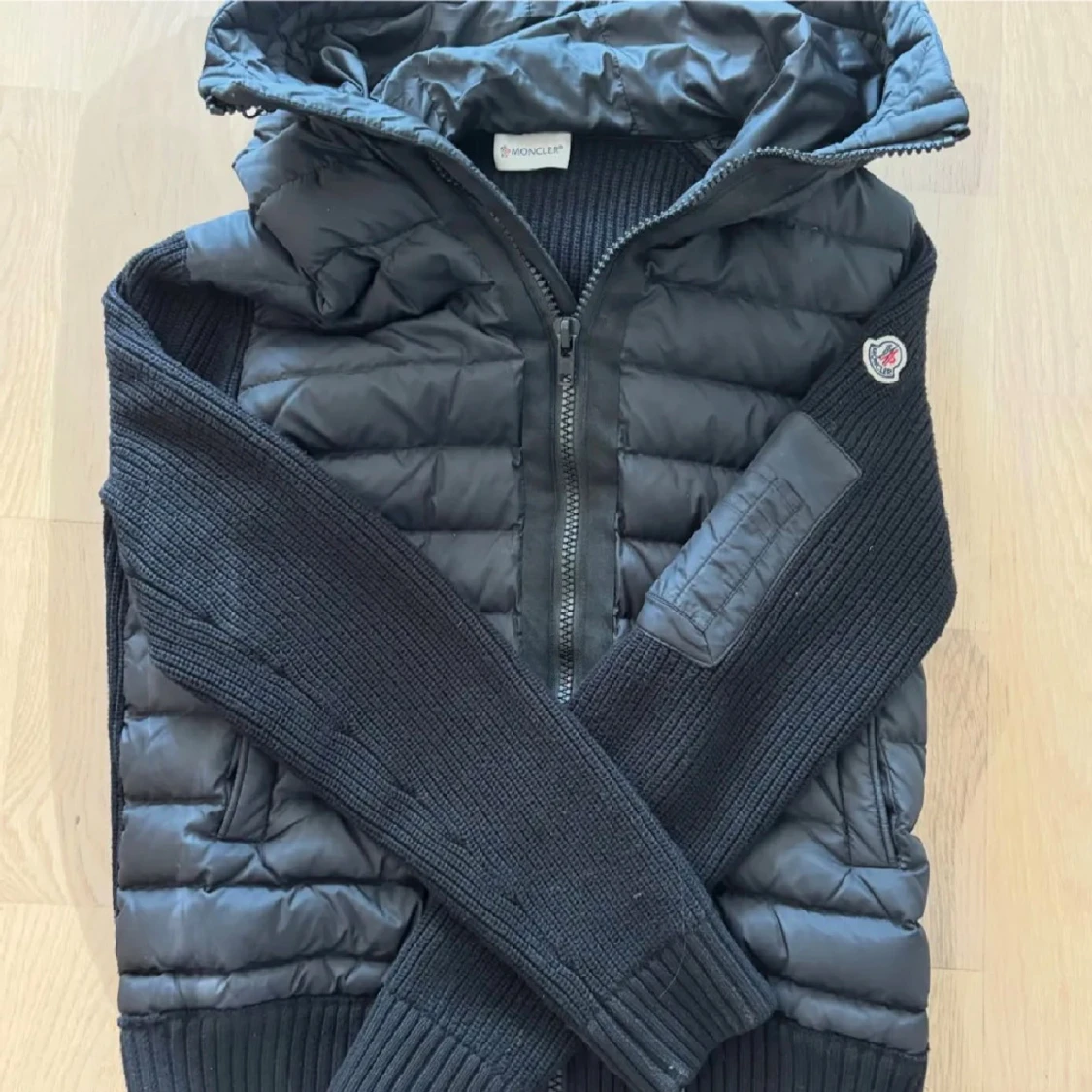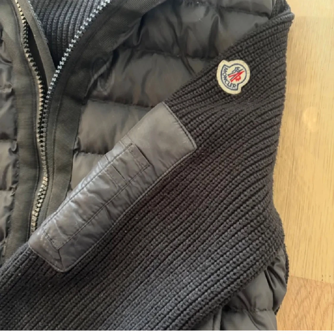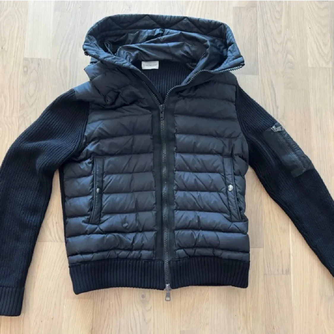 Svart pufferjacka från Moncler med stickade ärmar och vadderad kropp. Jackan har huva, dragkedja framtill och ribbade muddar. Moncler-logga på ena ärmen och praktiska fickor med knappstängning. Perfekt för kyliga dagar.