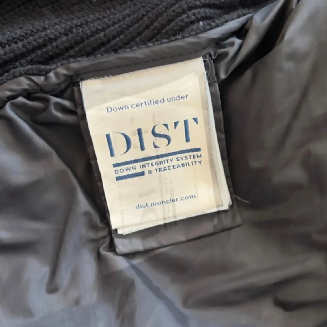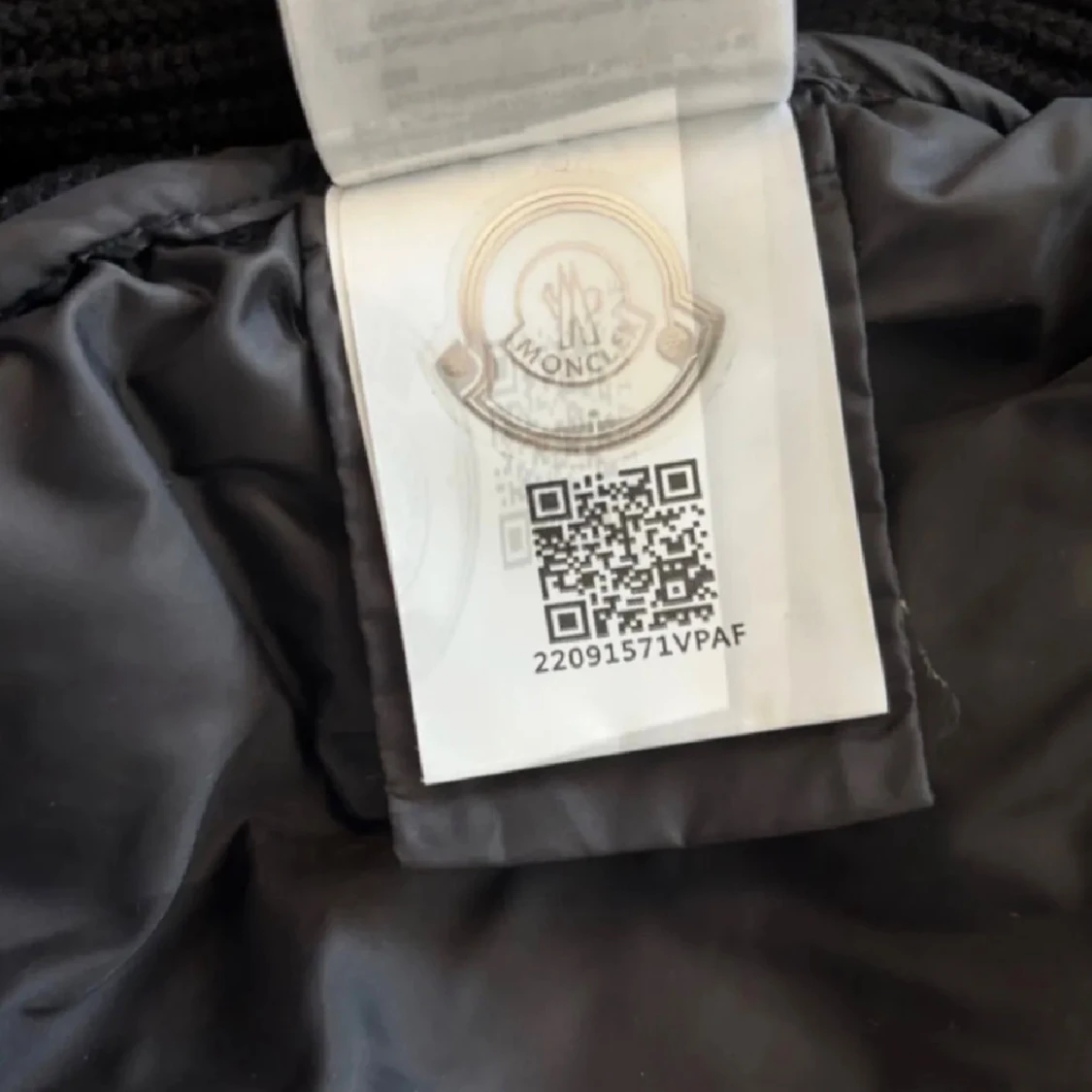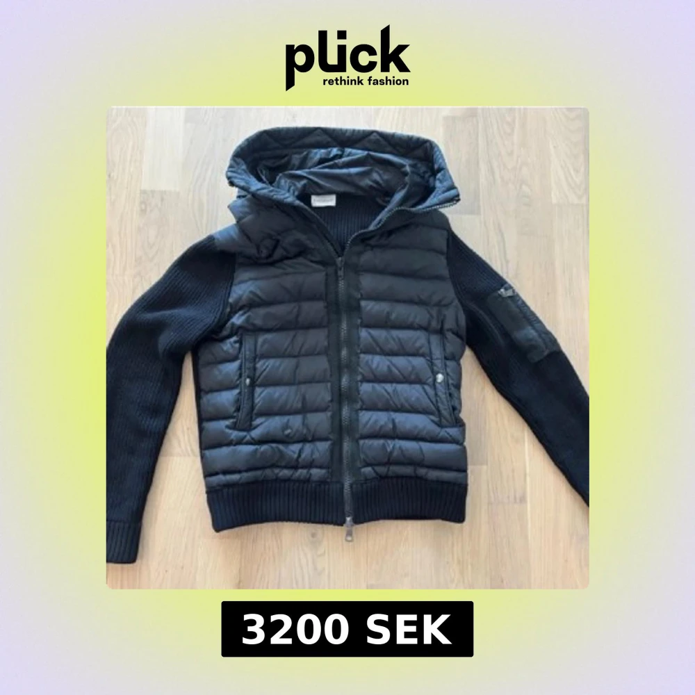 Svart pufferjacka från Moncler med stickade ärmar och vadderad kropp. Jackan har huva, dragkedja framtill och ribbade muddar. Moncler-logga på ena ärmen och praktiska fickor med knappstängning. Perfekt för kyliga dagar.