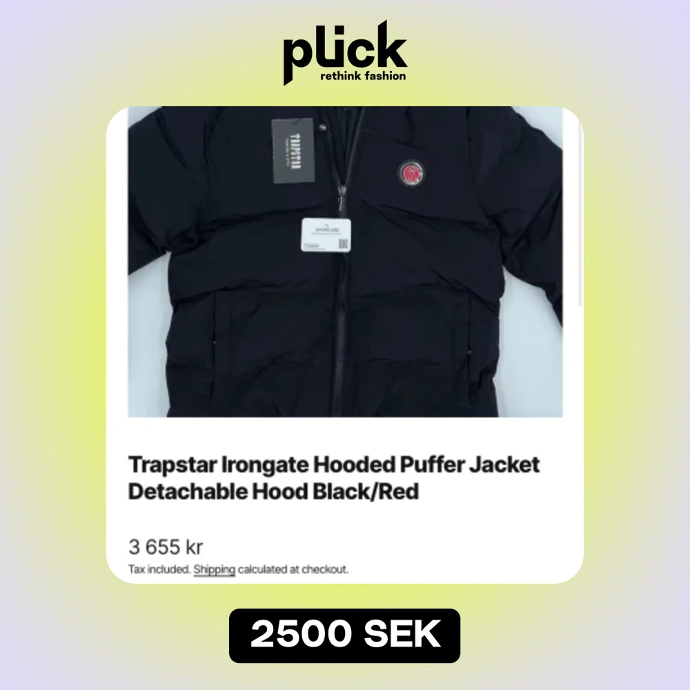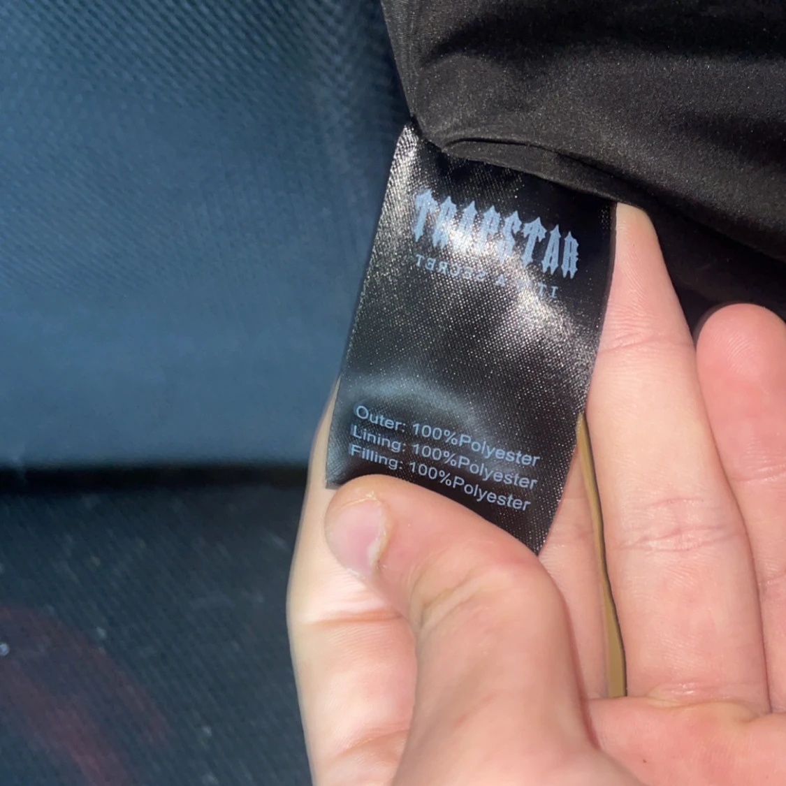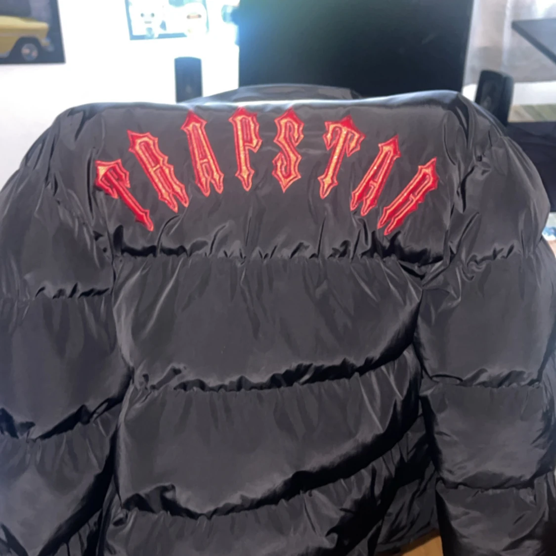 Säljer en snygg och varm pufferjacka från Trapstar med avtagbar huva. Jackan är svart med röda detaljer och har en cool Trapstar-logga på ryggen. Den är tillverkad i 100% polyester vilket gör den både lätt och bekväm. Perfekt för kalla dagar!