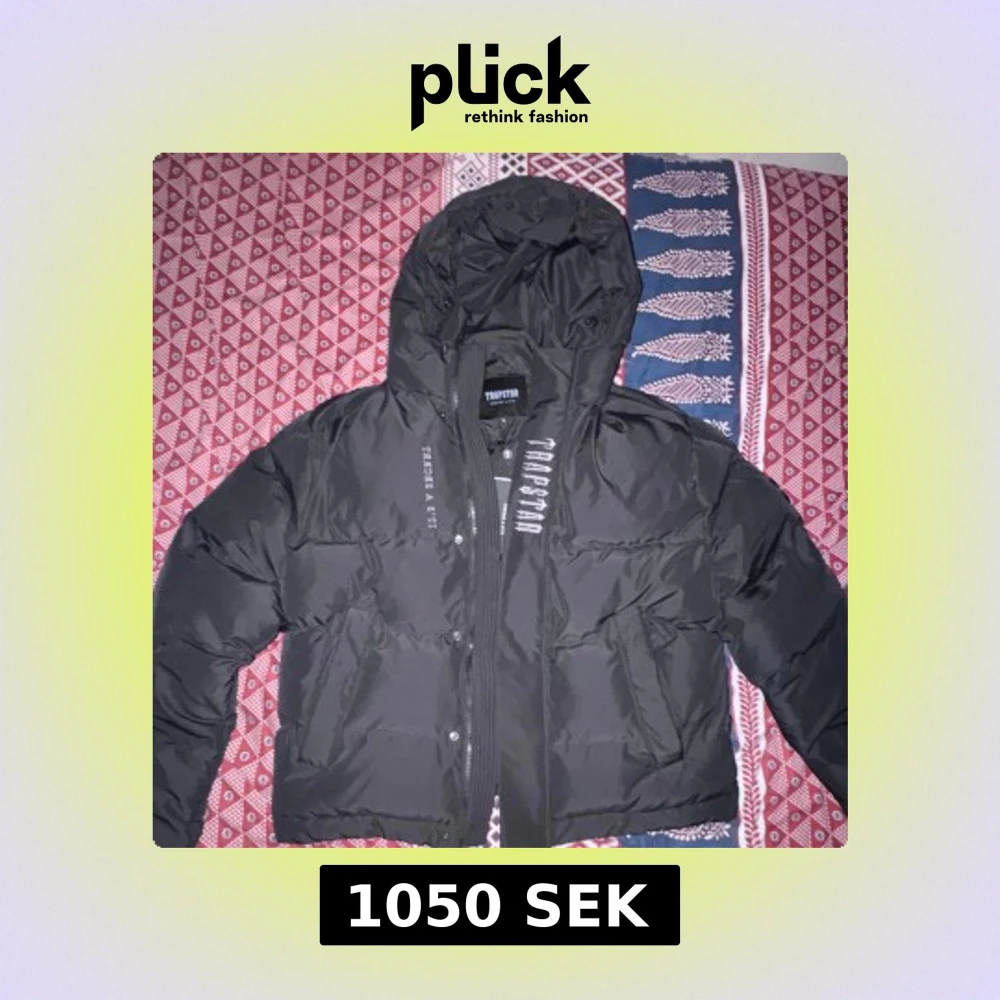 Svart pufferjacka från Trapstar med broderad logga på bröstet och stor Trapstar-text på ryggen. Jackan har huva, dragkedja och tryckknappar framtill. Oversized passform och cool streetstil, perfekt för kalla dagar.