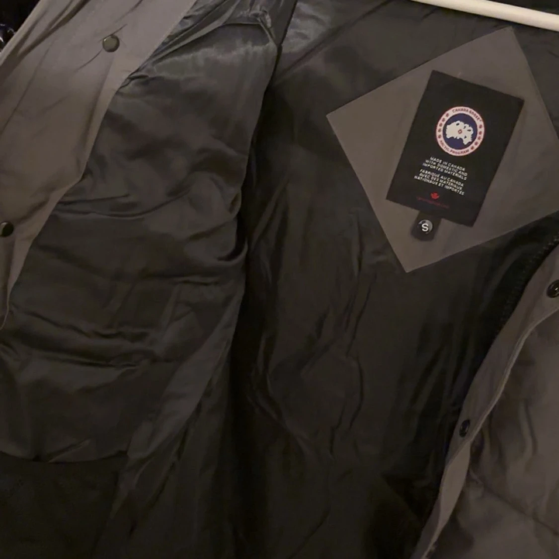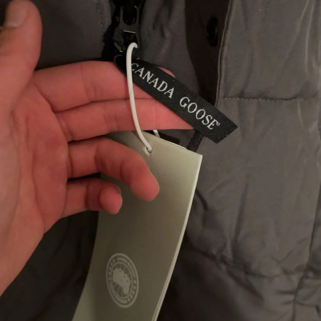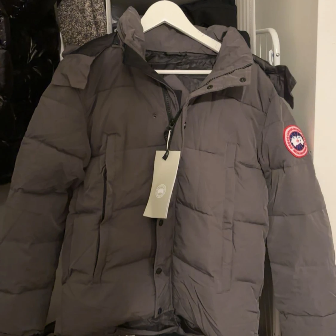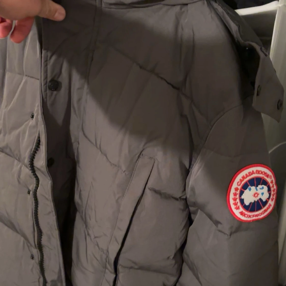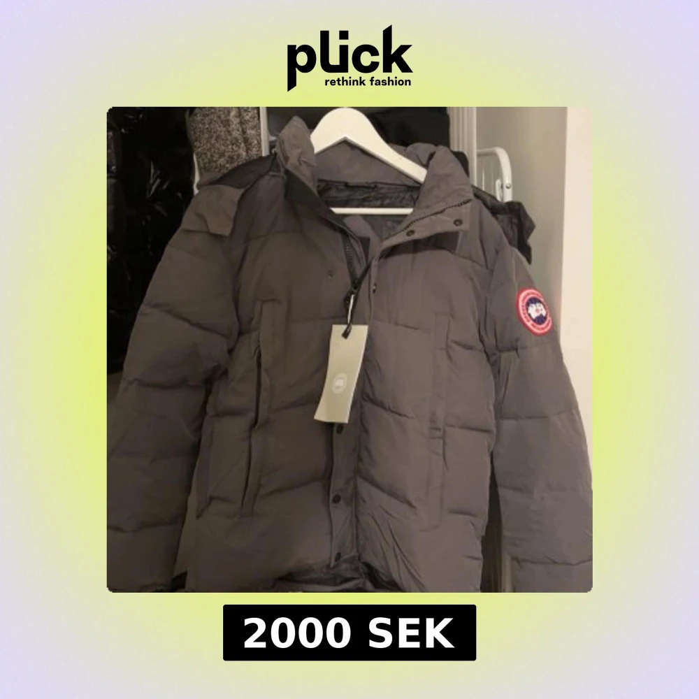 Säljer en grå dunjacka från Canada Goose med klassisk patch på ärmen. Jackan har quiltad design, huva och både dragkedja och knappar framtill. Perfekt för kalla dagar och har en clean look som funkar till allt. Fickor på sidorna och snygga detaljer. Alla tags är kvar.
