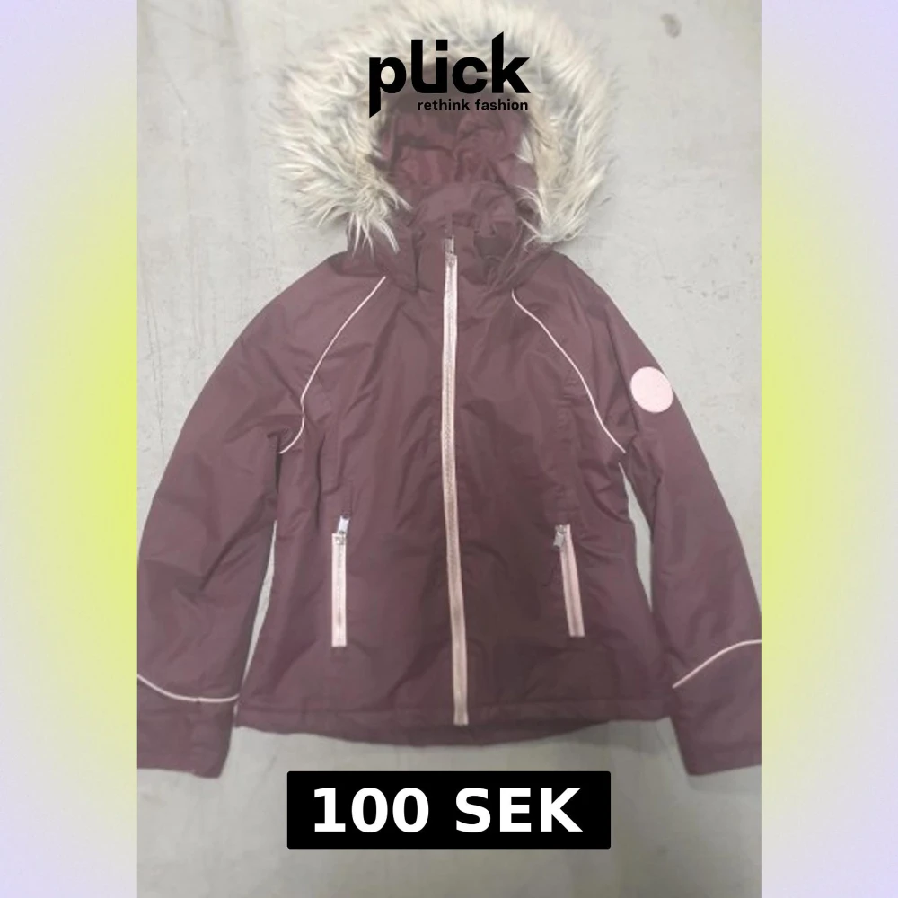 Snygg lila vinterjacka från H&M med fuskpäls på huvan och ljusrosa detaljer. Jackan har dragkedja framtill, två fickor med dragkedja och ett coolt rosa märke på ärmen med texten 'Support Your Local Girl Crew'. Perfekt för kalla dagar!
