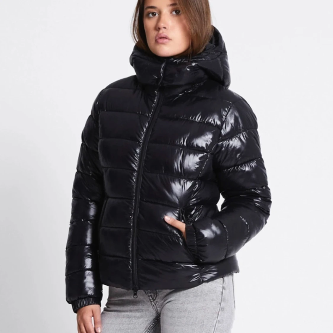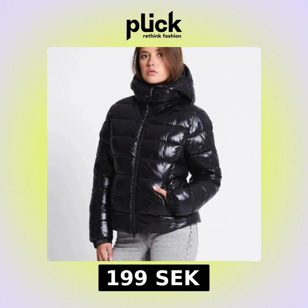 Svart glansig vinterjacka, köpt förra vintern och användes några gånger, inga skador. Storlek M men passar mig som brukar ha S