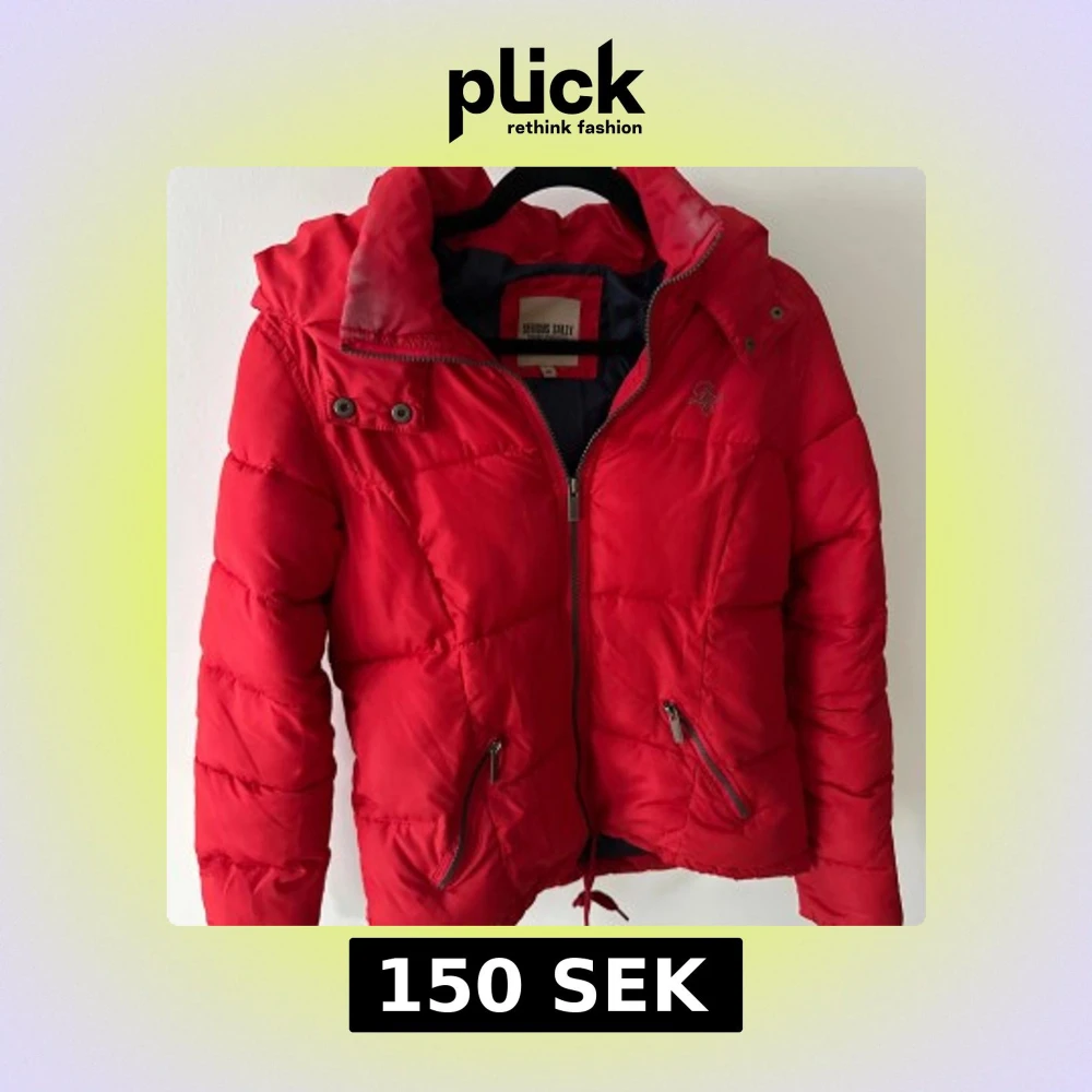 Röd tjock vinterjacka. Jackan är i jättebra skick, den enda deffekten är det synliga slitaget vid kragen som ses på bild.