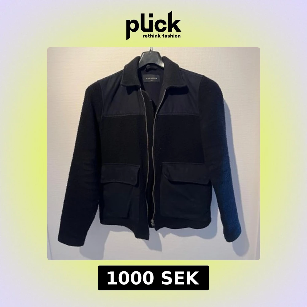 Blå ull jacka med krage och två stora fickor framtill. Jackan har en snygg mix av material med ull, polyester och bomull. Perfekt för lager-på-lager.