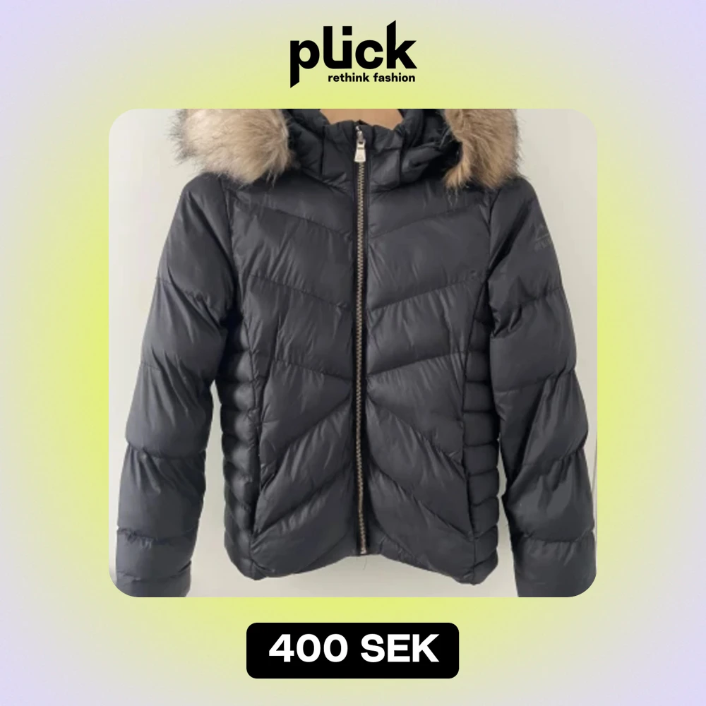 Bra skick, svart jacka med avtagna huva, Fuskpäls. Guldiga detaljer på dragkedja och fickor.