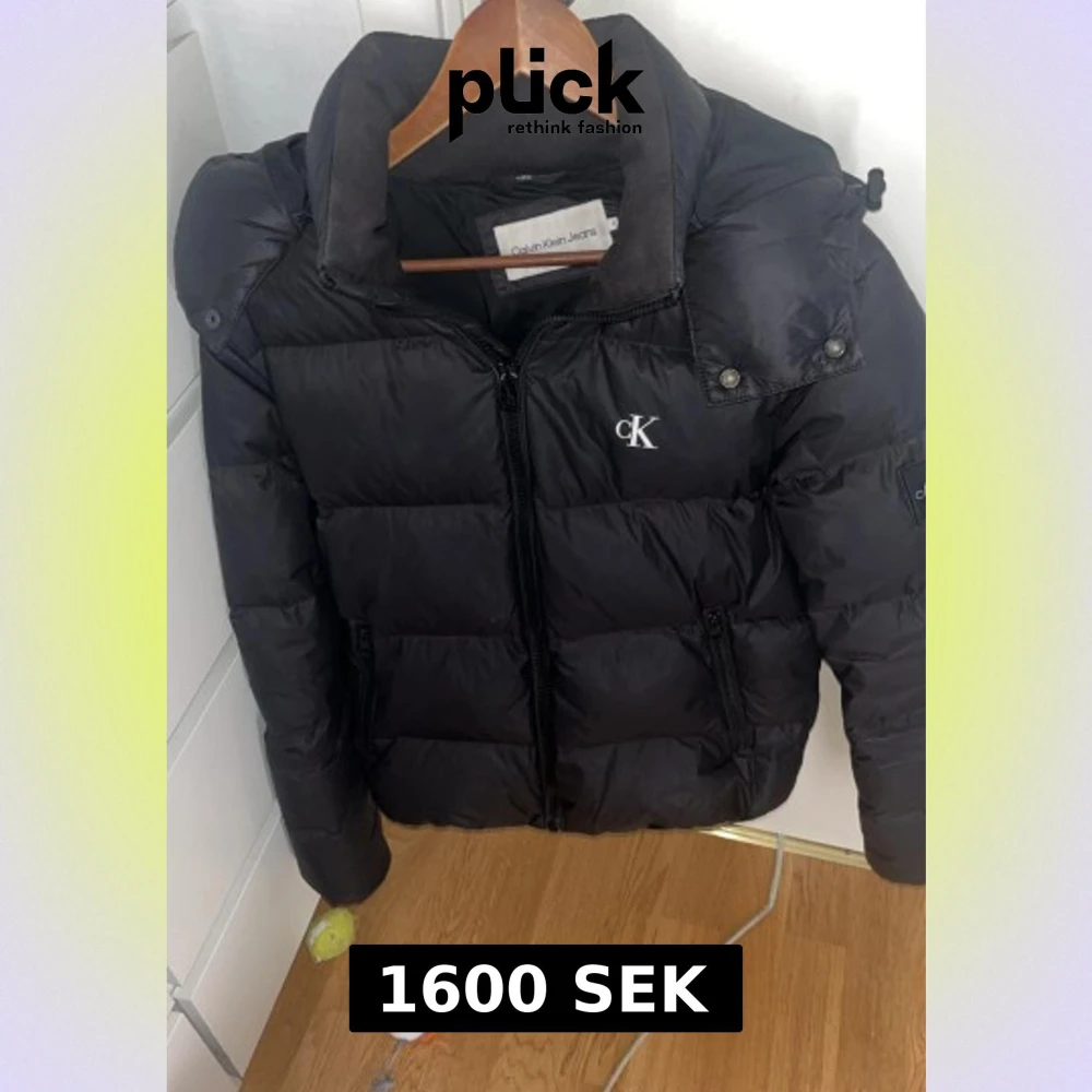 Det är en äkta Calvin Klein vinter/dunjacka och den är varm. Den har förlorat lite effekt av de puffiga i jackan vid armväken och högre upp vid ryggen men de är inte riktigt något man lägger märke till. Det finns kvitto på den och den är bara använd i en vinter säsong. Den har inga skador alls inget är trasigt.