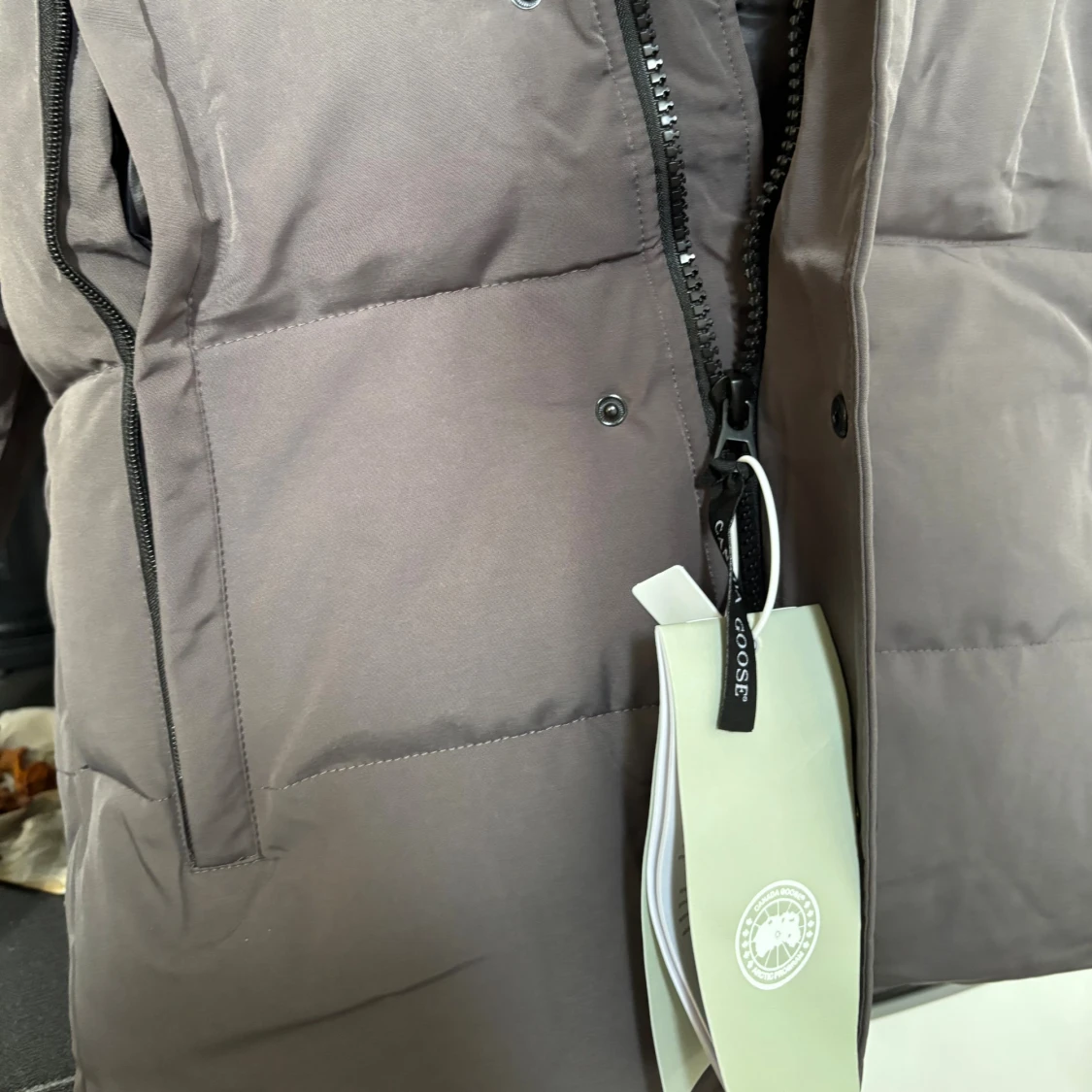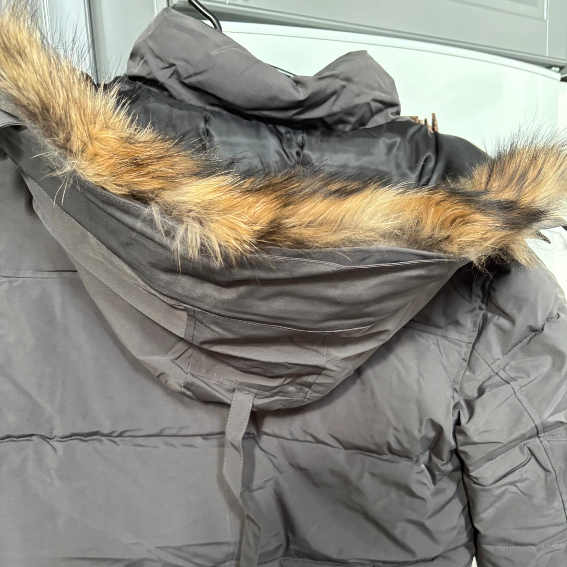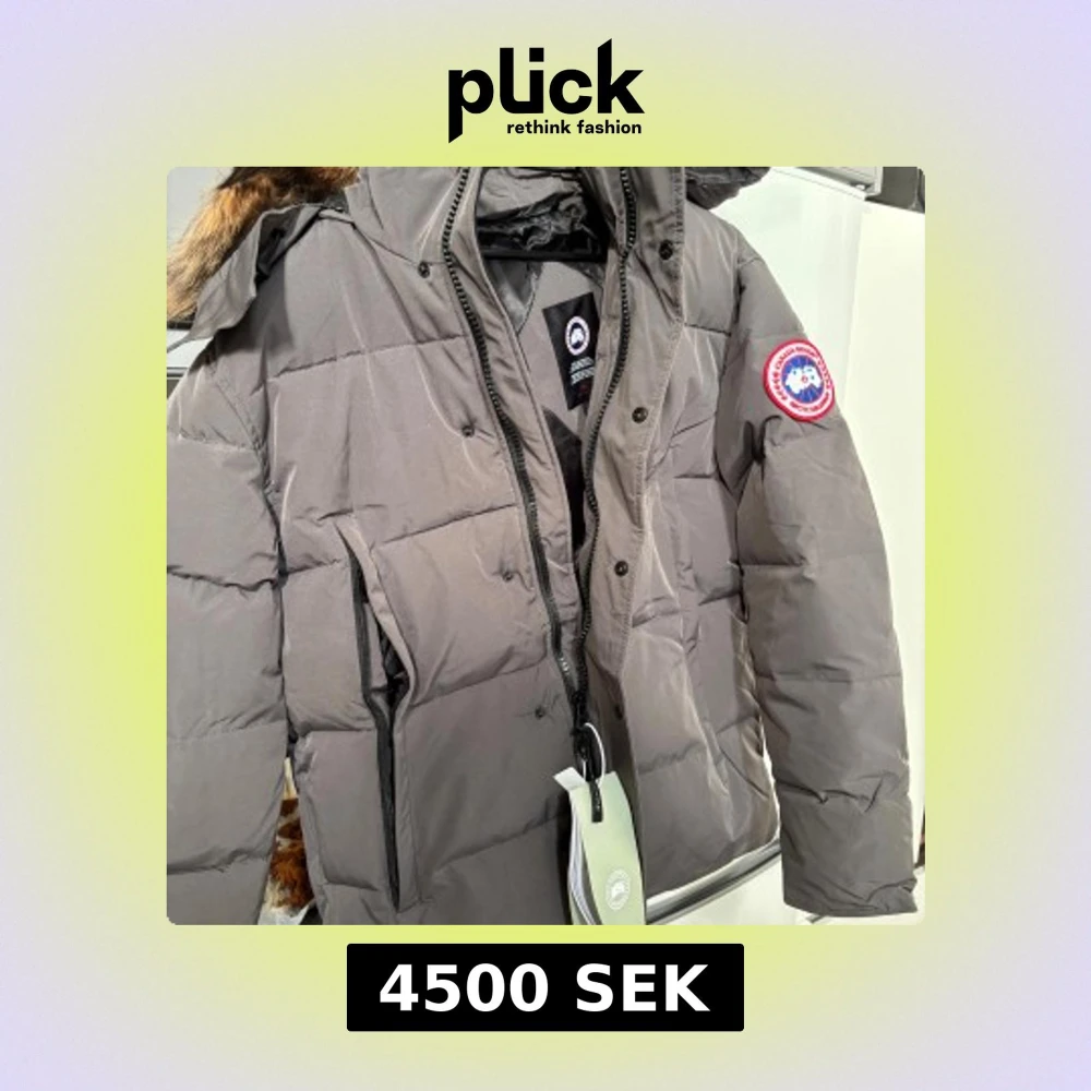 Säljer en grå dunjacka från Canada Goose med ikonisk patch på ärmen. Jackan har huva med fuskpäls, dragkedja och knappar framtill samt praktiska fickor. Perfekt för kalla vinterdagar och riktigt snygg streetstil. Nyskick