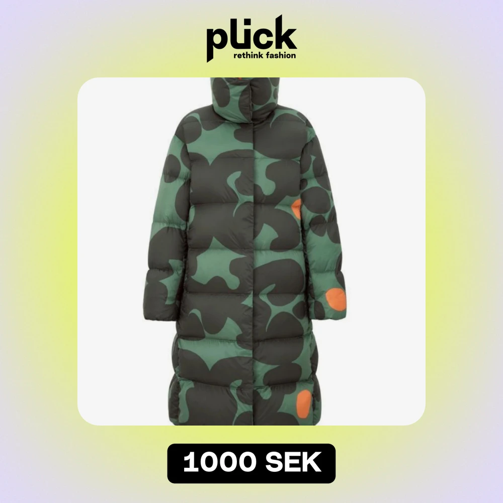 Säljer varm och lätt dunjacka från Marimekkos samarbete med Uniqlo i grönt och svart med orange detaljer. Jackan har ett unikt camouflagemönster och är perfekt för kalla vinterdagar. Den är lång och har långa ärmar, vilket gör den extra mysig. Passar i någon mellan XS och S i stl.