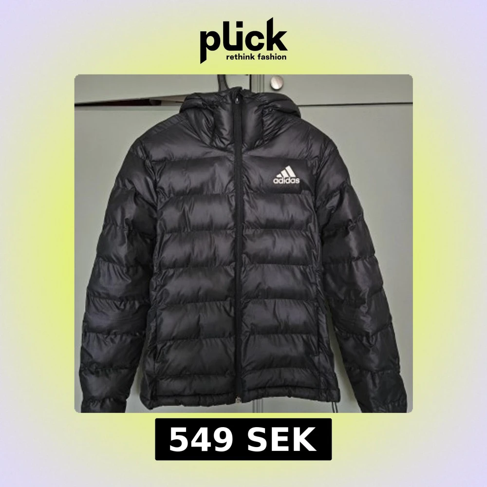 Säljer en svart dunjacka från Adidas i storlek S. Jackan har huva, dragkedja framtill och klassisk Adidas-logga på bröstet. Den är quiltad och har en clean, sportig look som passar perfekt när det är kallt ute.