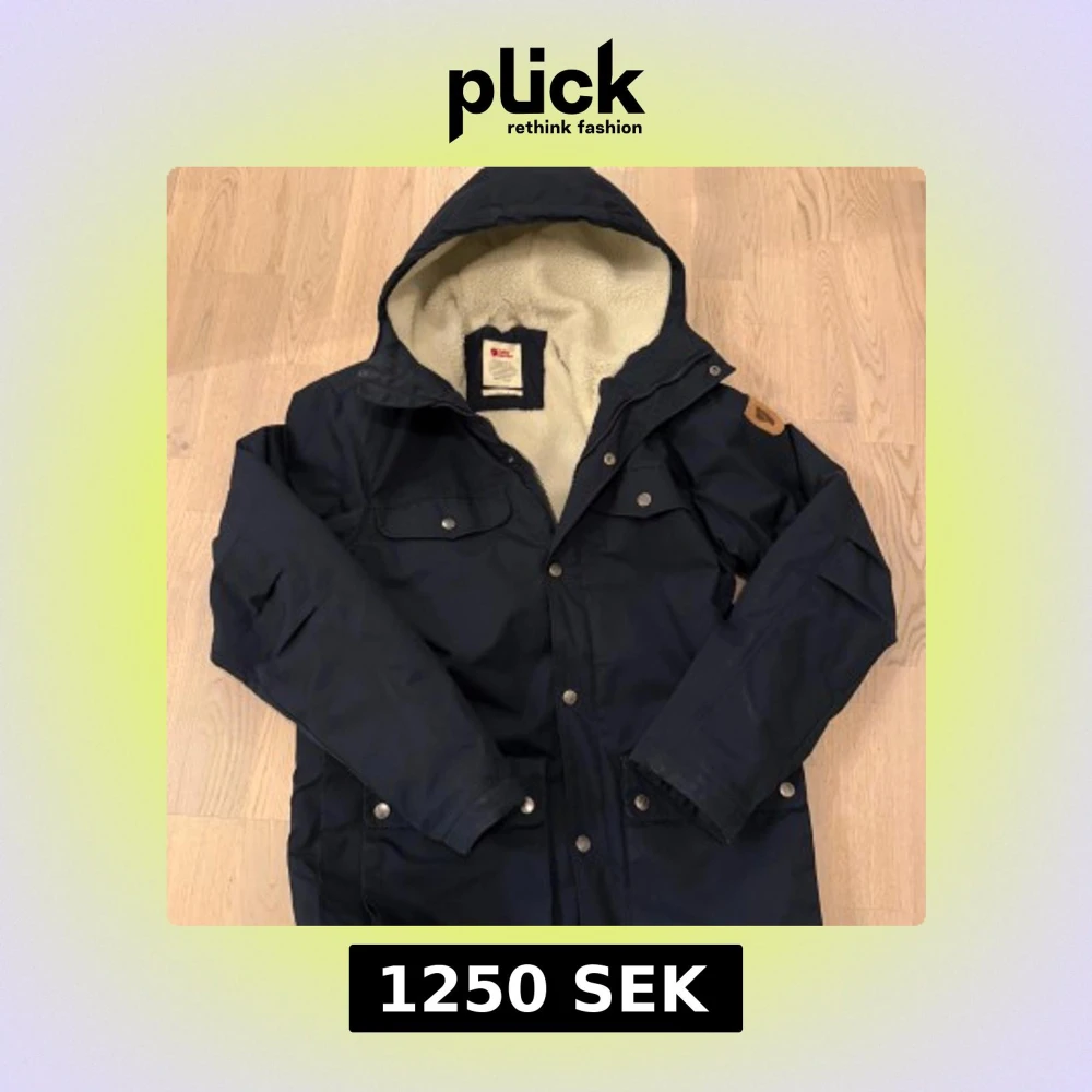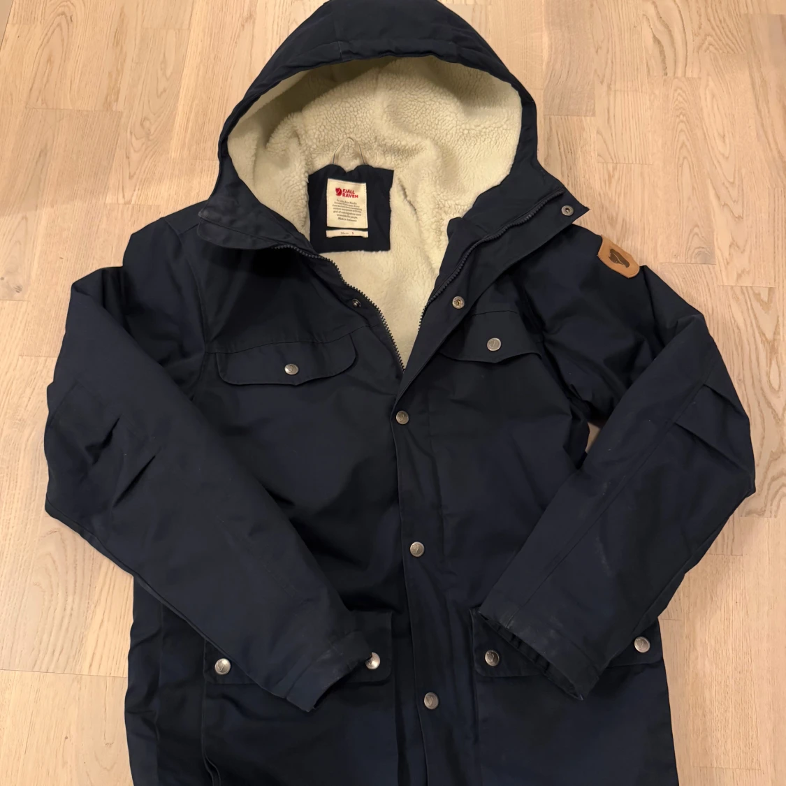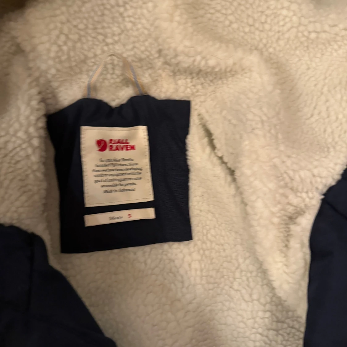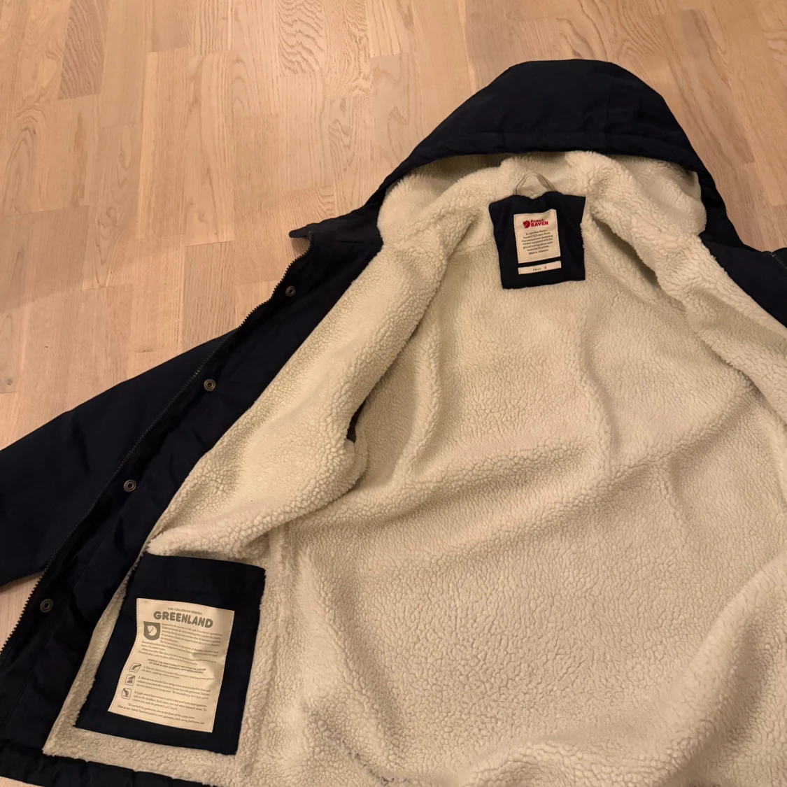 Vinterjacka från Fjällräven i marinblått med mysigt vitt fleecefoder och huva. Jackan har flera fickor med knappar, dragkedja och tryckknappar framtill samt klassisk Fjällräven-logga på ärmen. Perfekt för kalla dagar och outdoor vibes. Modellen heter Greenland och nypris ligger runt 3500kr. Hör av er vid frågor!
