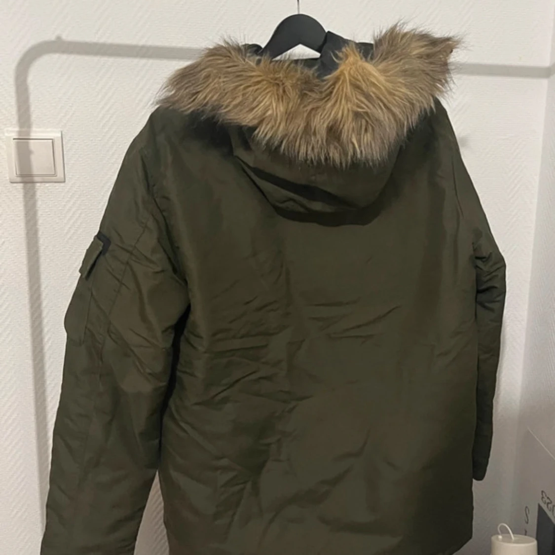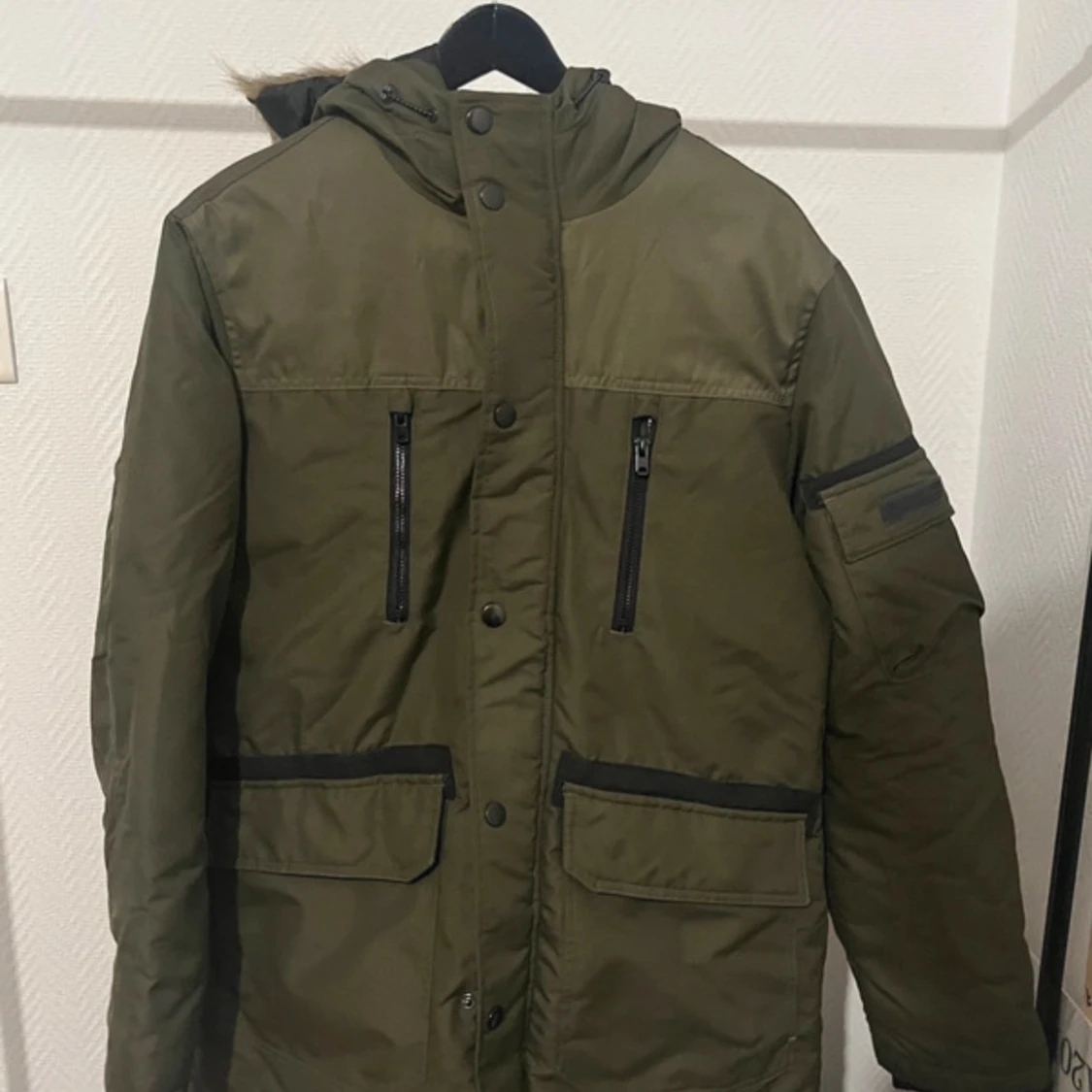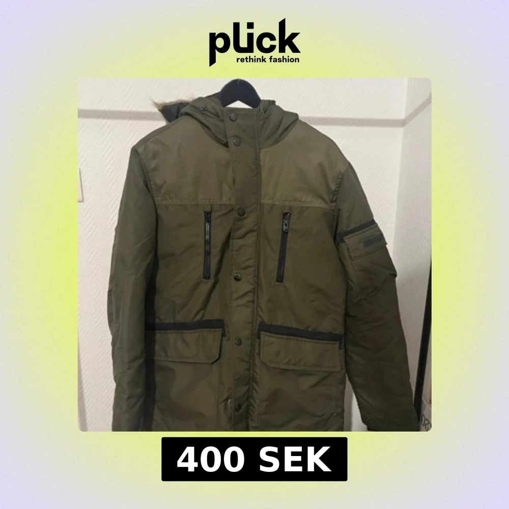 Snygg grön parkajacka från Jack & Jones med huva och fuskpälsdetalj. Jackan har flera praktiska fickor med dragkedja och knappar. Perfekt för kyliga dagar. Extremt varm och oanvänd, mer eller mindre ny. Kan gå med på nån deal, skicka iväg ett pris/fråga!