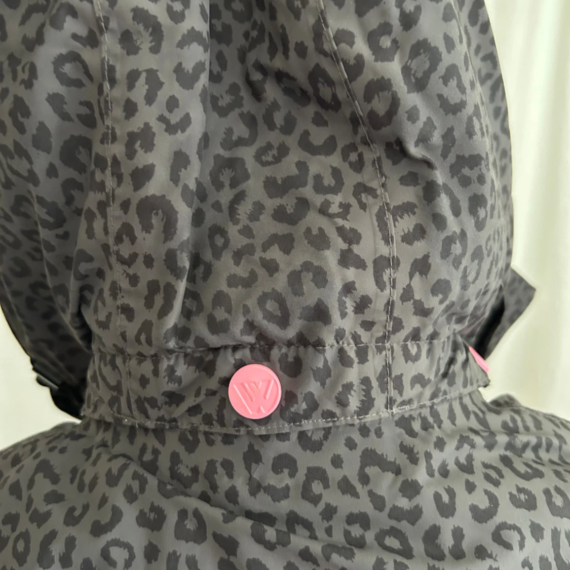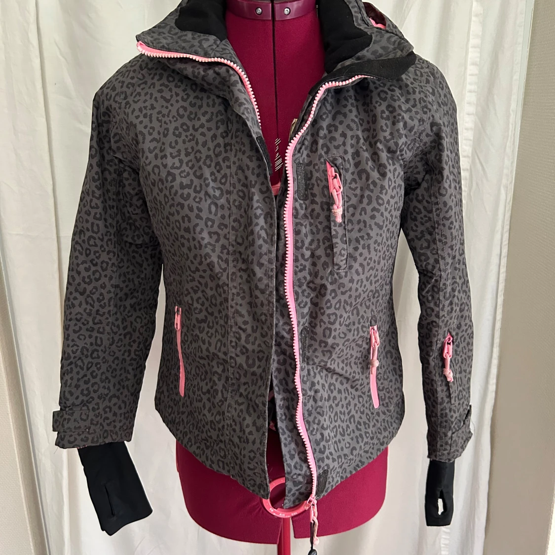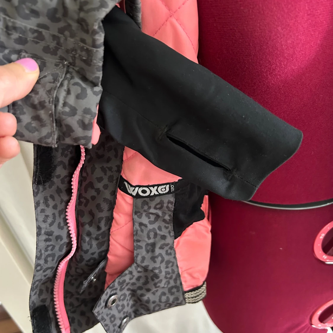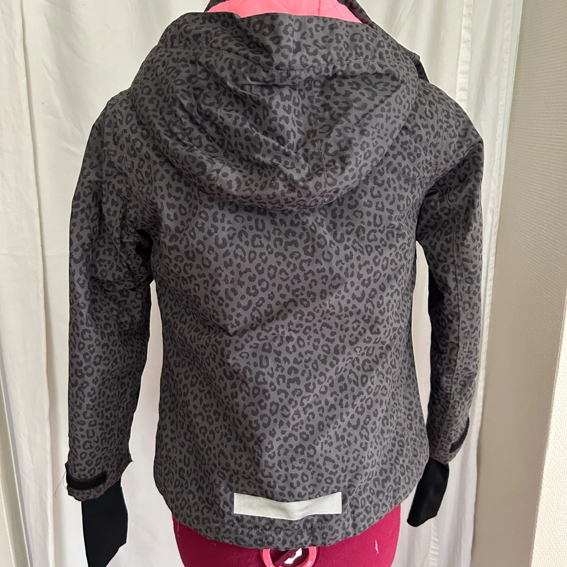Grå vinterjacka med svart leopardmönster och rosa detaljer från Wox. Jackan har huva, flera fickor med rosa dragkedjor och svarta muddar med tumhål. Insidan är quiltad och har borttagbart snölås. Tyvärr ser de ljusrosa delarna lite dassiga ut, men jackan har mer kvar att ge. (Diskret namnad på insidan)