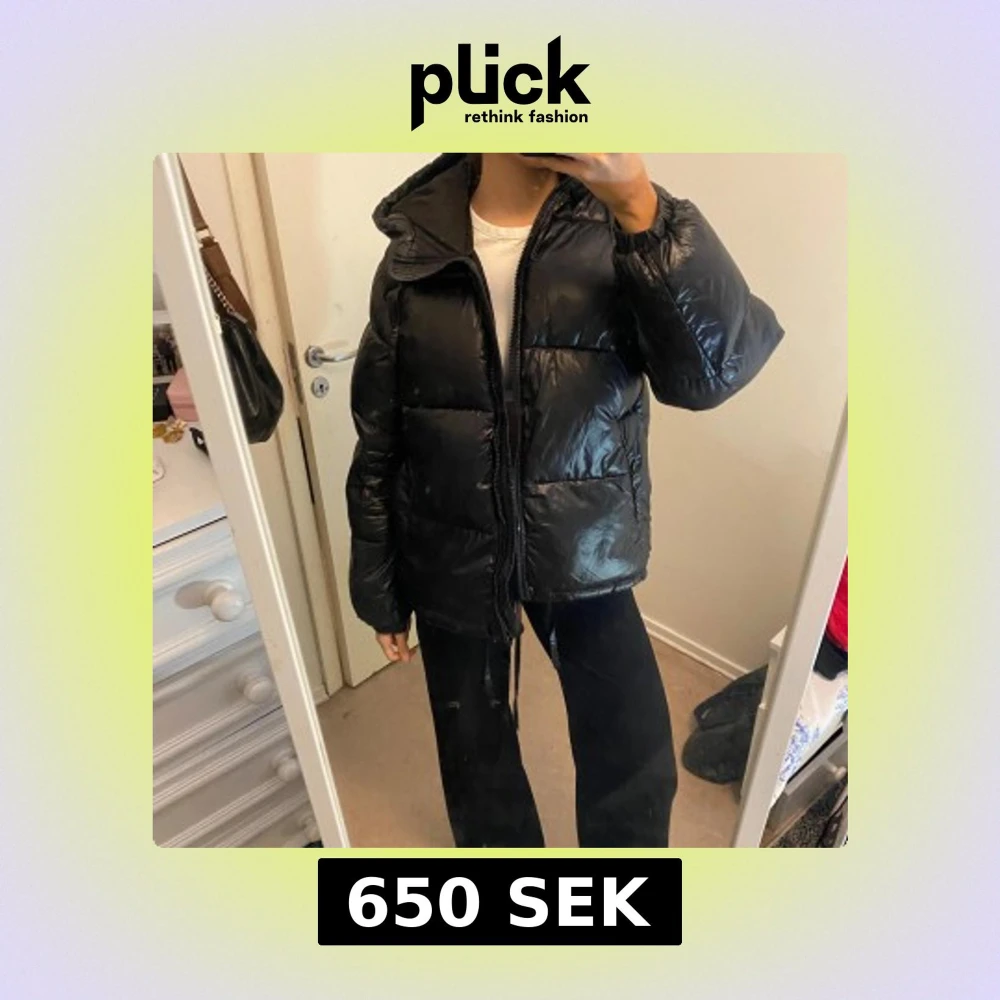 Säljer en svart pufferjacka med dragkedja. Jackan har en glansig yta och är perfekt för kyligare dagar. Den har långa ärmar och en hög krage för extra värme. Passar bra till både vardag och utflykter.