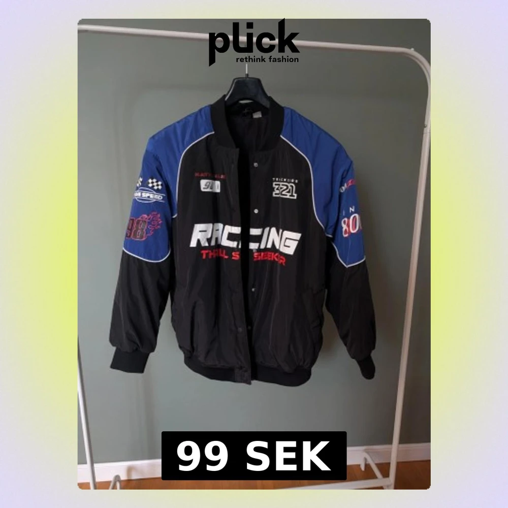 Säljer en svart och blå bomberjacka med racing-inspirerade tryck och brodyr. Jackan har ribbade muddar, tryckknappar och coola detaljer som siffror, flaggor och texten 'RACING THRILL SEEKER'. Materialet är syntet och jackan har en loose passform.