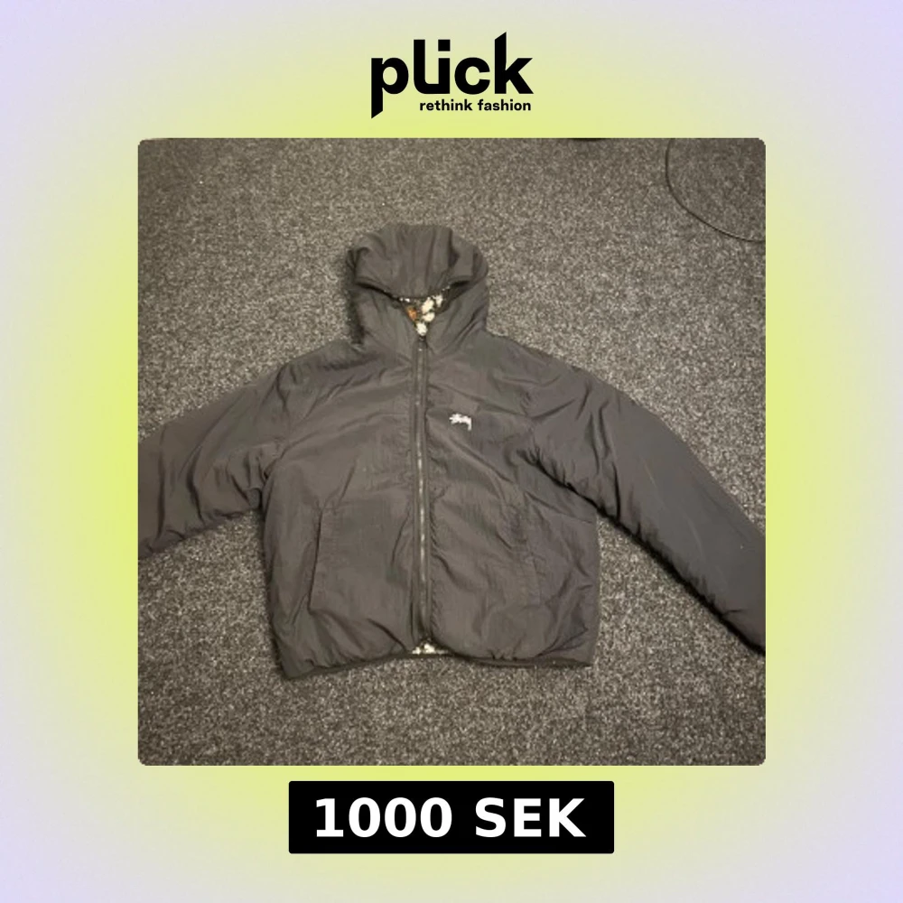 Säljer en fet reversibel teddyjacka från Stüssy med huva. Ena sidan är svart med diskret logga och dragkedja, andra sidan är fluffig med mönster i vitt, svart och brunt samt bröstficka med logga. Perfekt för dig som vill switcha stil snabbt.