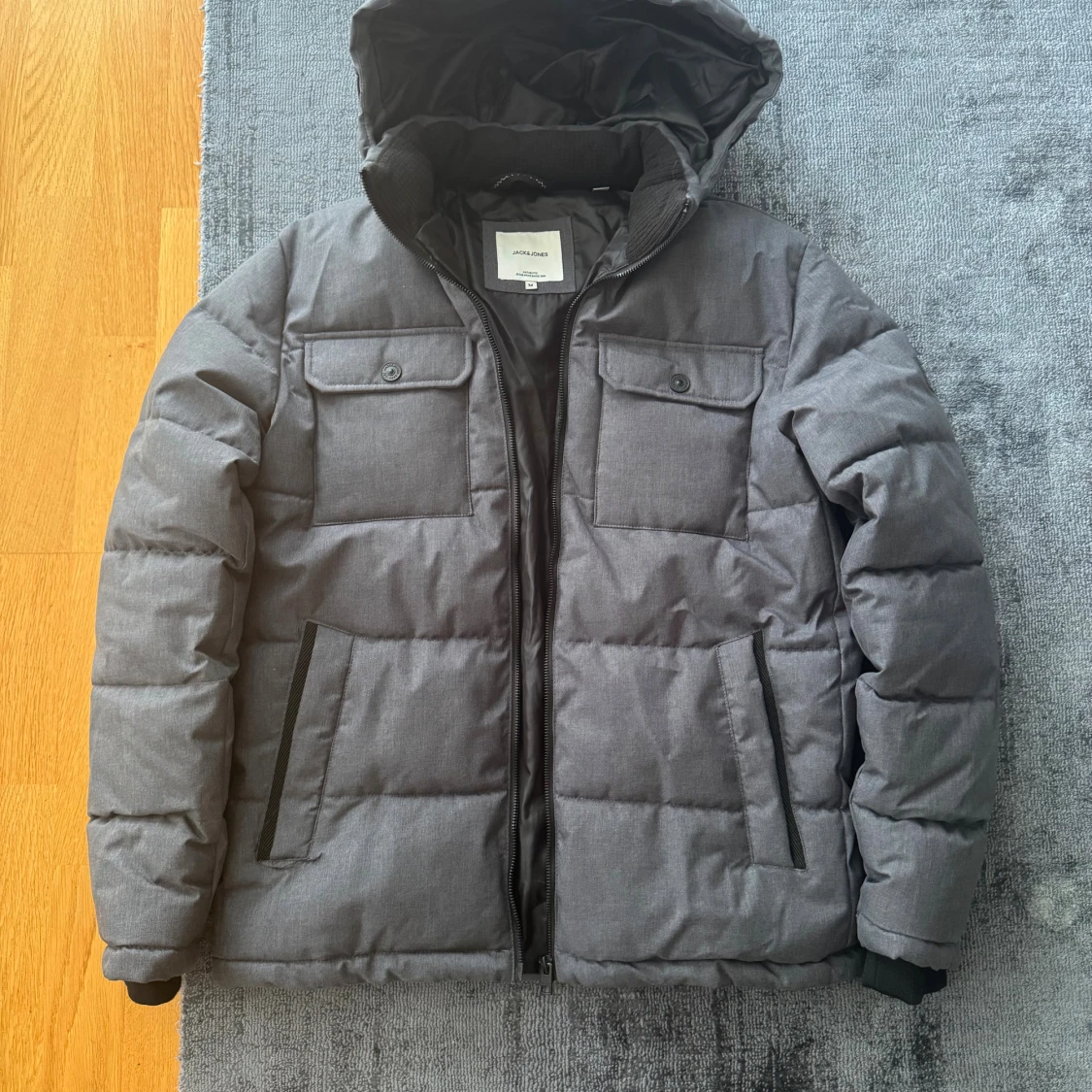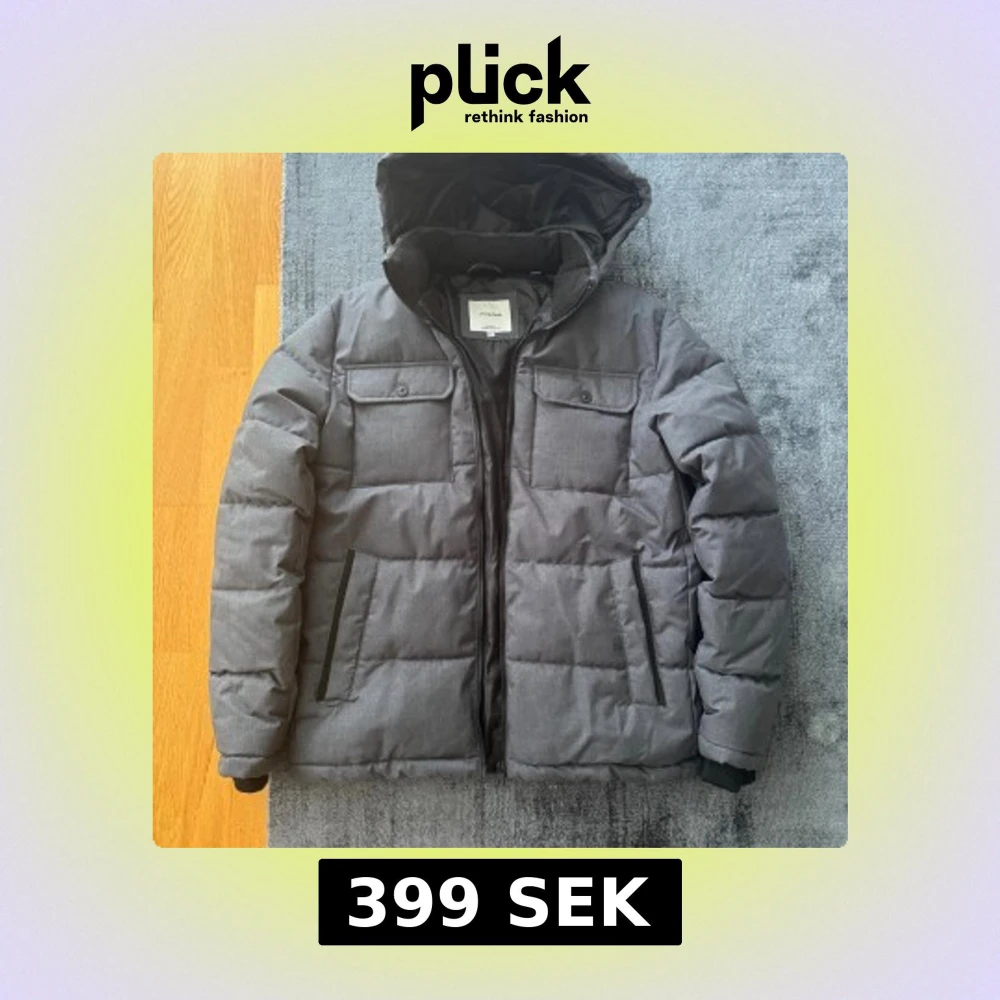 Snygg grå pufferjacka från Jack & Jones med huva och två stora bröstfickor med knappar. Jackan har dragkedja framtill och två sidofickor. Perfekt för kalla dagar och har en modern, boxig passform.