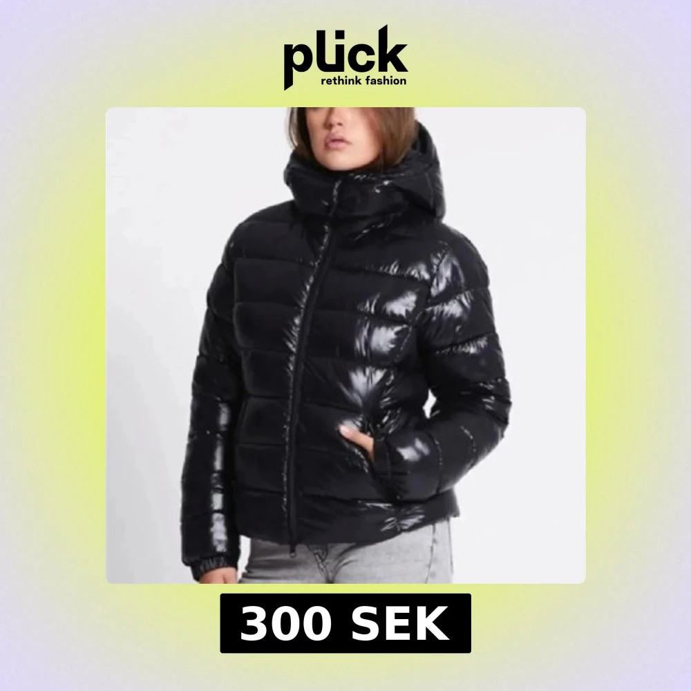 Svart pufferjacka med glansig finish och stor huva. Jackan har dragkedja framtill, knappar vid kragen och breda, quiltade paneler. Perfekt för kalla dagar och riktigt snygg till jeans eller cargobyxor.