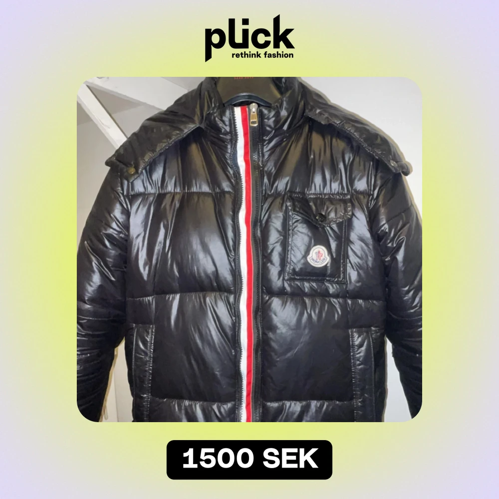 Säljer en snygg svart pufferjacka från Moncler. Den har en cool glansig finish och en dragkedja med röd och vit detalj. Perfekt för kalla dagar med sin varma vaddering. Jackan har en bröstficka med Moncler-logga och två sidofickor. Passar perfekt för vintern! ❄️