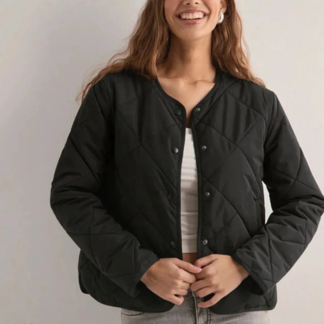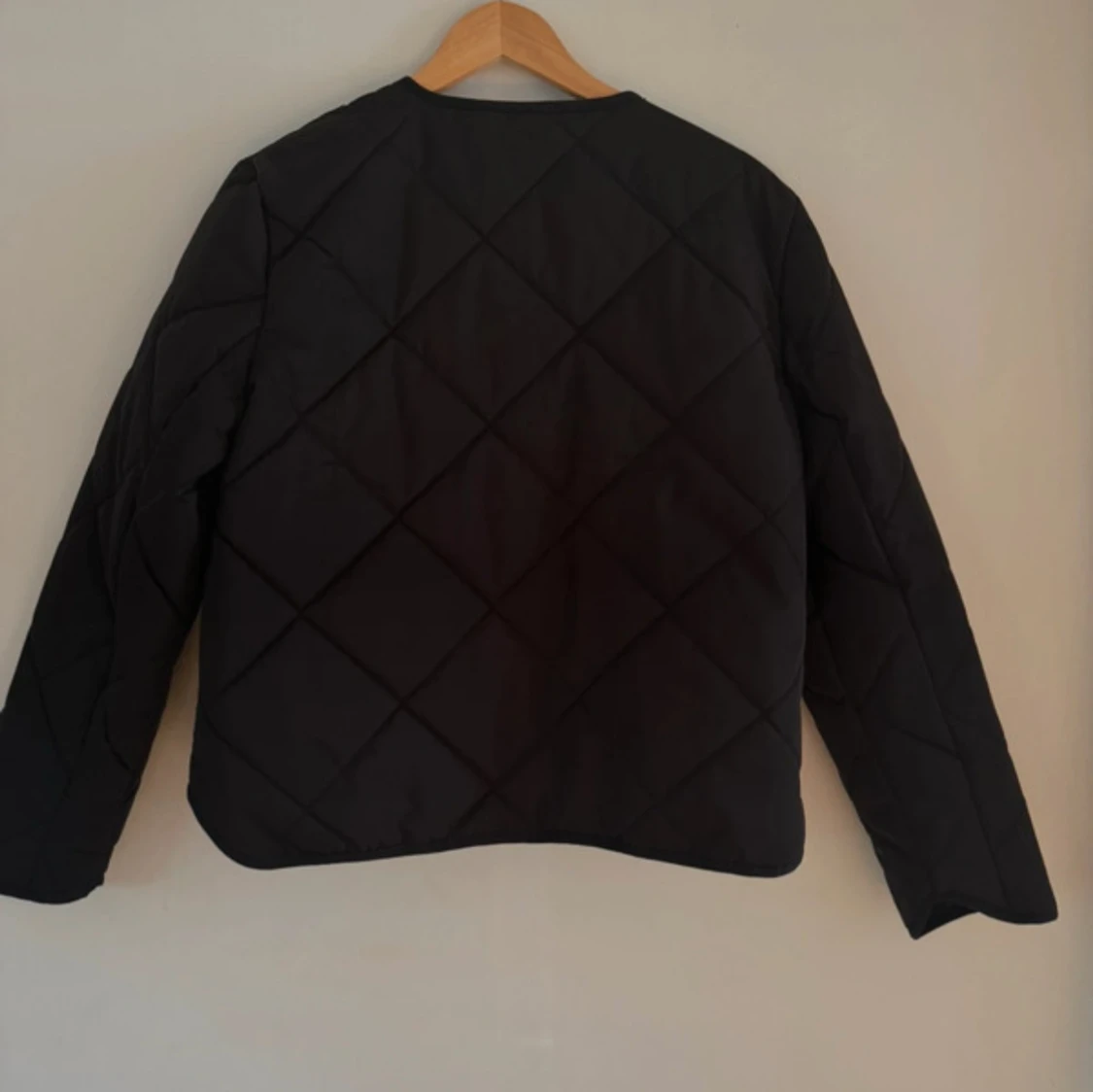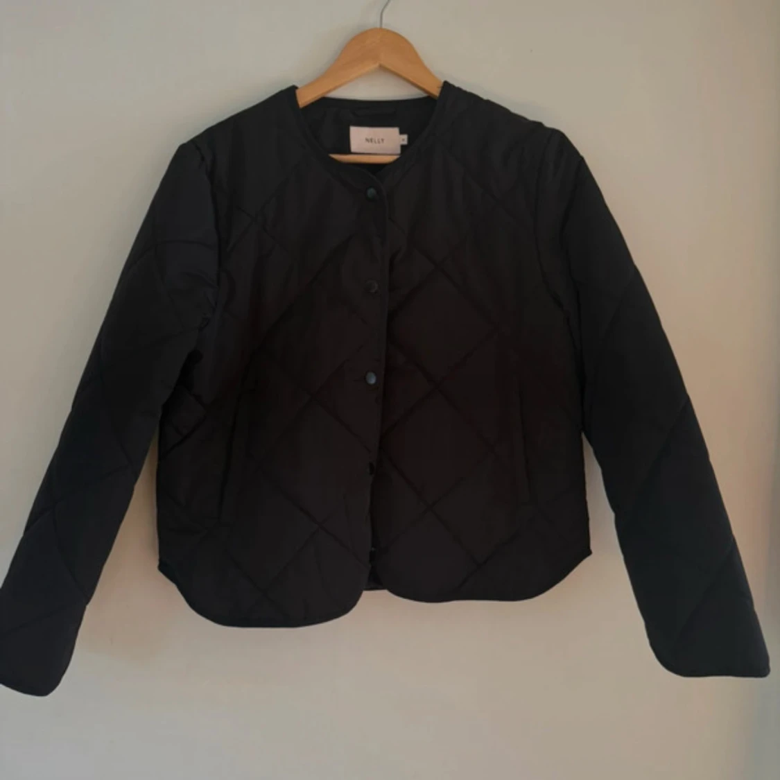 Quiltad svart jacka från Nelly med rund halsringning och tryckknappar framtill. Jackan har lång ärm, rakt snitt och diskret rutmönster i tyget. Perfekt för lager-på-lager och enkel att styla till jeans eller kjol. Använd en gång som ny. Skriv privat för flera frågor!