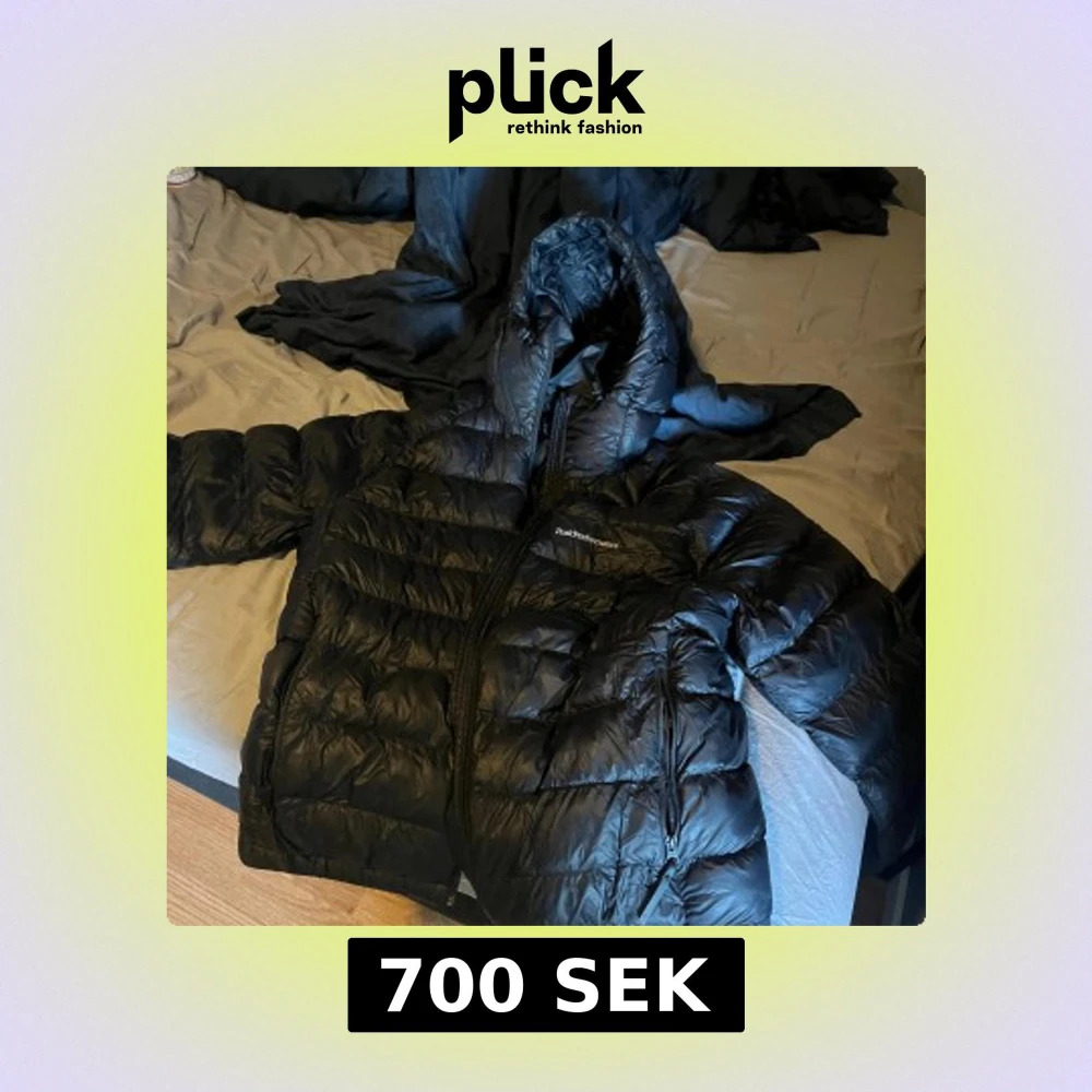 Svart dunjacka från Peak Performance med huva och dragkedja. Jackan är quiltad och har en clean, sportig look. Perfekt för kalla dagar och enkel att matcha med allt. Klassisk logga på bröstet och praktiska fickor med dragkedja. Fickan har ett litet hål men går enkelt stt sy igen.