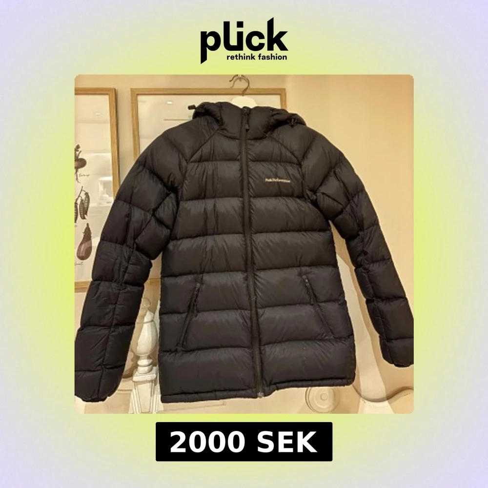 Svart dunjacka från Peak Performance med huva och dragkedja framtill. Använt jackan i en säsong men den är i gott skick! Nypris: 3500 men säljer för 2000!