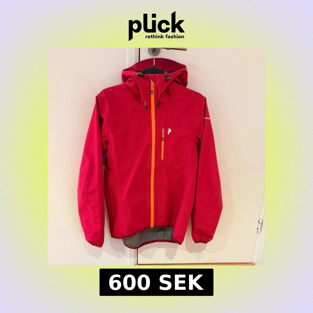 Snygg röd rosa vindjacka från Peak Performance med huva och orange dragkedja. Jackan har en bröstficka med dragkedja, elastiska muddar och diskreta loggor på bröstet och huvan. Perfekt för blåsiga dagar och outdoor-aktiviteter. Skicket på jackan är mycket bra men använd och storleken är S.