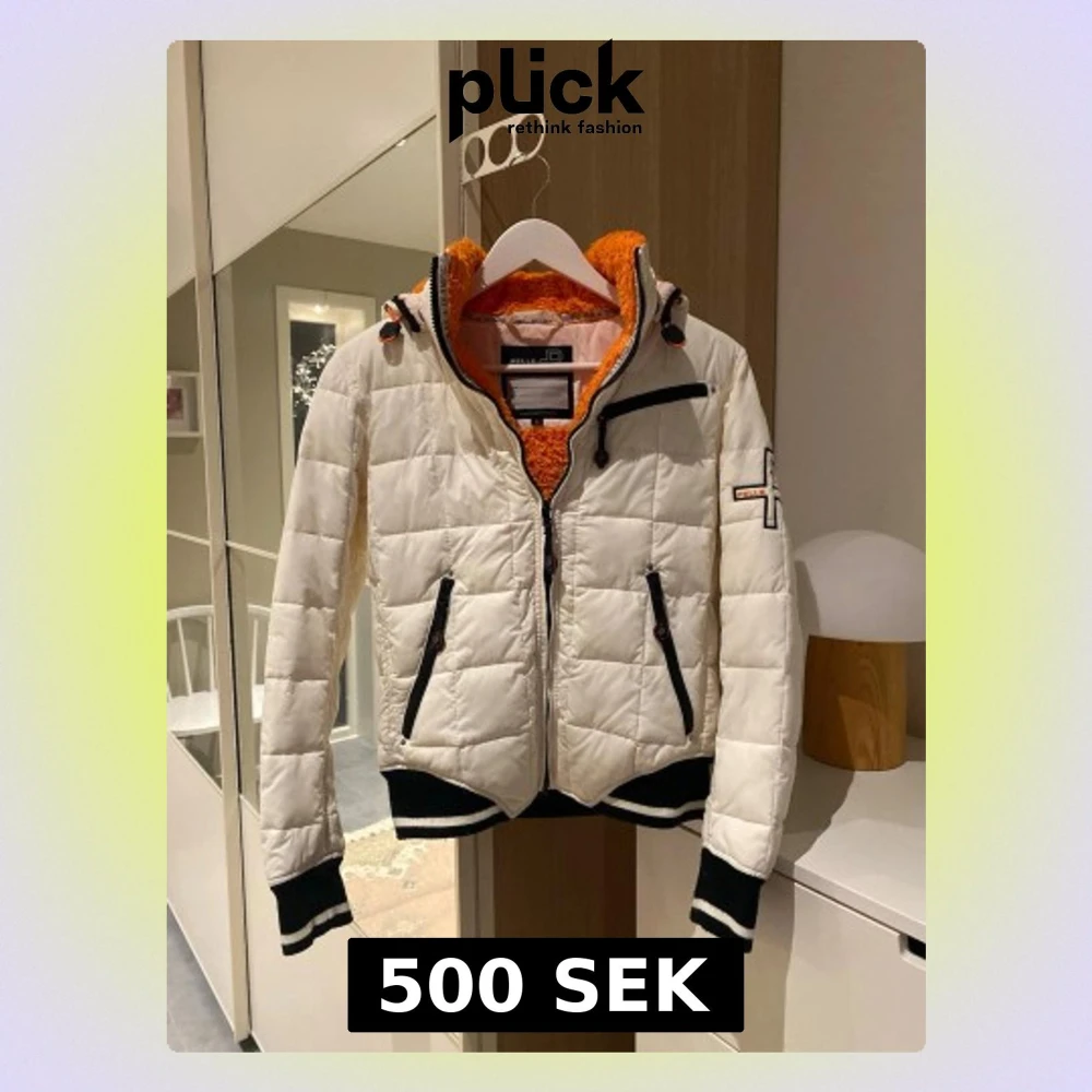 Vit jacka från Pelle P med orange teddyfoder, svarta detaljer och dragkedjor. Jackan har ribbade muddar med vita ränder, huva och flera praktiska fickor. Perfekt för dig som gillar sportig och snygg stil.