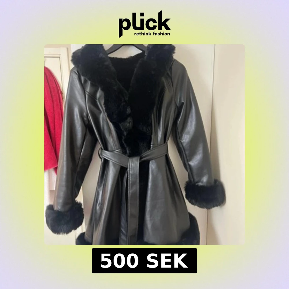 Snygg svart skinnjacka med mjukt pälsfoder och pälsdetaljer på huva, ärmslut och nederkant. Jackan har bälte i midjan för en schysst siluett och är perfekt för kalla dagar. Långärmad och med en cool, lite oversized vibe. Den är använd bara en gång men den är helt ny inga skador eller någonting.