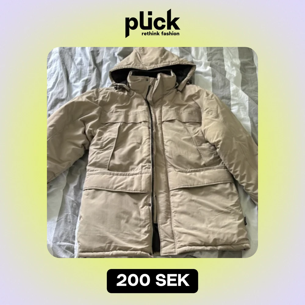 En biege dunjacka med ett polyester regnskal i storlek L.