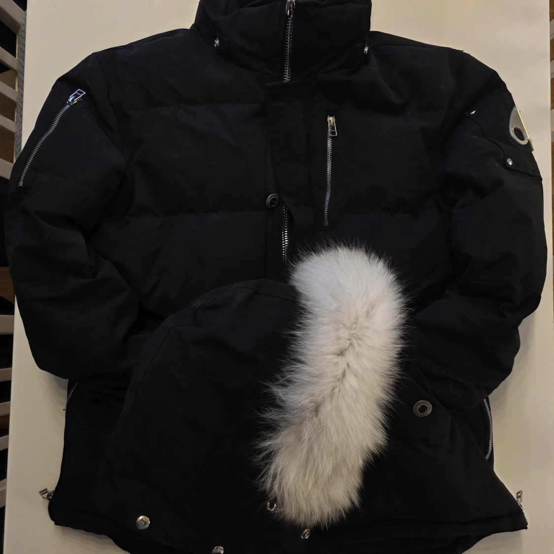 Säljer en svart dunjacka från Moose Knuckles med avtagbar huva och lyxig pälskant i vitt. Jackan har flera dragkedjor, fickor, metallogo på armen och en klassisk pufferlook. Perfekt för kalla dagar och riktigt snygg. Enligt alla reviews och recensioner är det den varmaste jackan någonsin – perfekt för iskalla vinterdagar. Det står 2XL i jackan, men den passar som en vanlig storlek L med tanke på att man bär en tröja under **säljs för billigt eftersom det inte är säsong