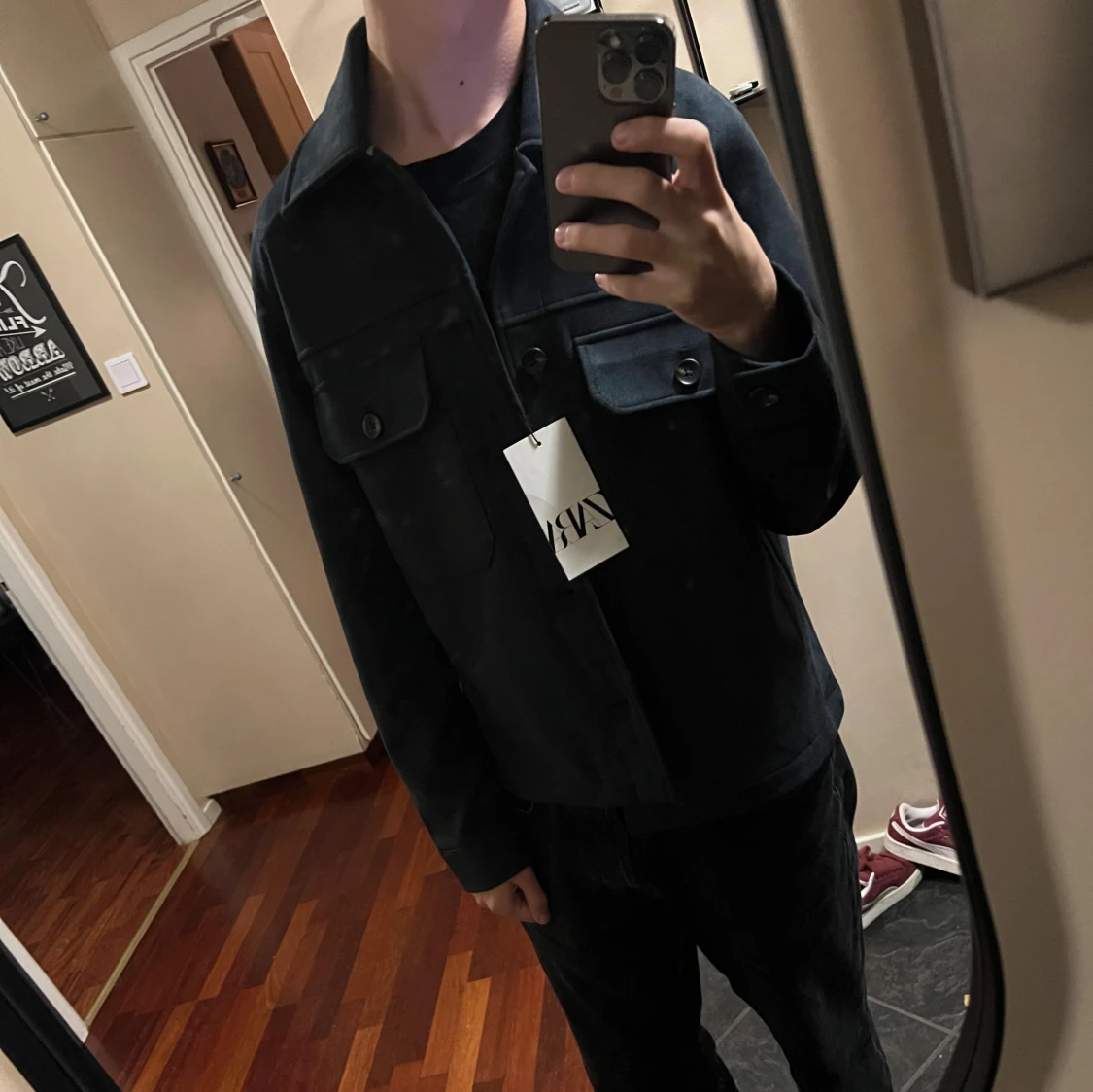 Sjukt snygg helt ny mörk navy overshirt från Zara med mocka-liknande yta. Jackan är helt oanvänd och har kvar zara-lappen från butik. Storleken är S och den passar dig som är mellan 175 och 185. Jag på bilden är 180. Det är bara att skriva vid frågor eller fler bilder. Kan gå ner i pris till 250 vid snabb affär!🔥)