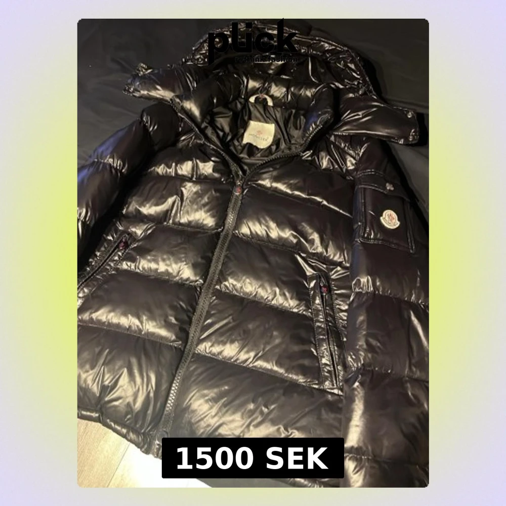 Säljer en svart pufferjacka från Moncler med glansig finish och avtagbar huva. Jackan har dragkedja framtill, två sidofickor med dragkedja och Moncler-logga på ärmen med NFC tagg. Materialet är syntet och dun, perfekt för kalla dagar. Insidan har ett coolt serietidningsmönster och en liten ficka med dragkedja. Väldigt varm