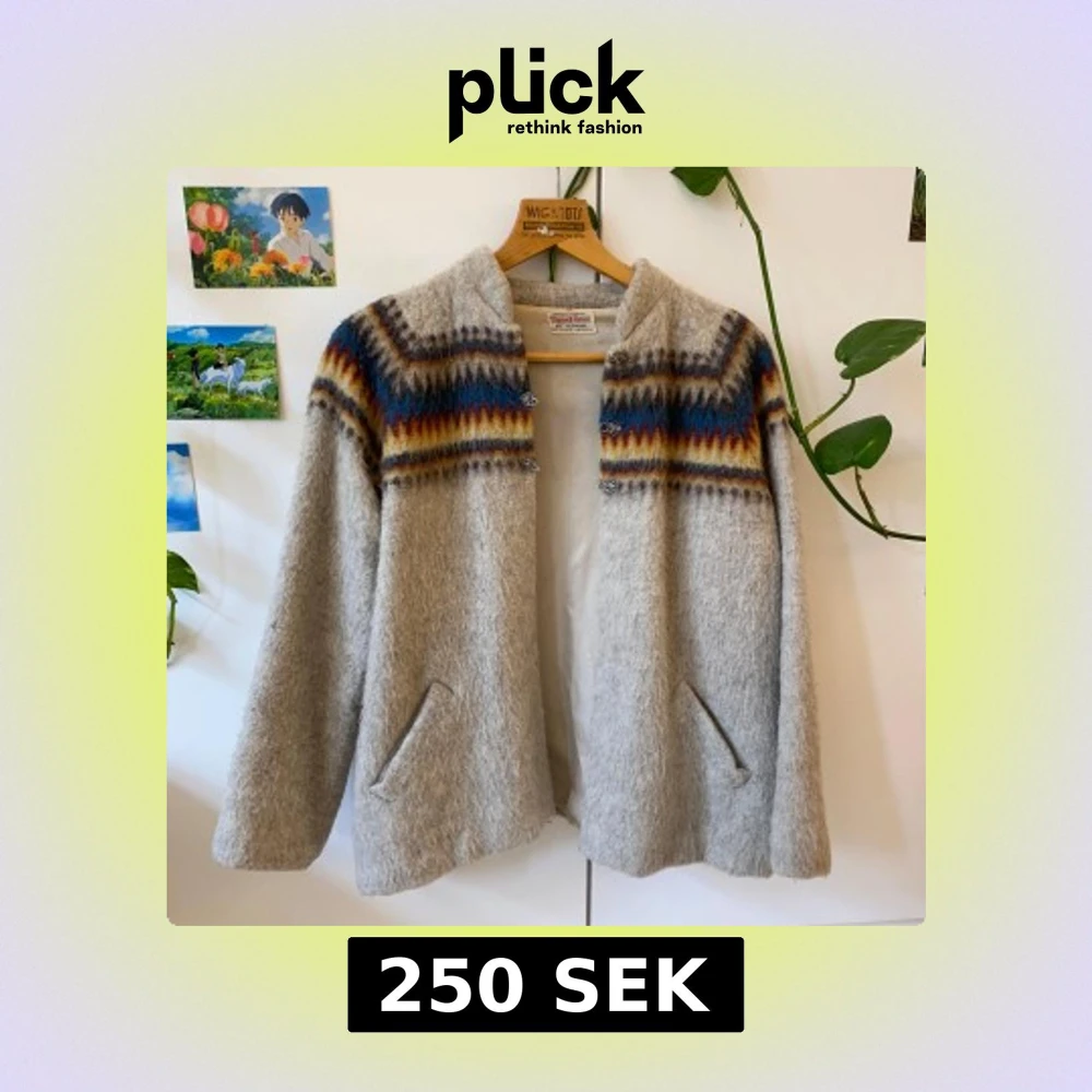 Handvävd jacka/kofta från Norge. Väldigt varmt material menat för vintertider. Gammal i använt skick. Ett spänne saknas (se bild fem) och den har haft några hål i sömmen som jag lagat. Superfin men tyvärr för kort i ärmarna för mig, skulle inte säga att den är storlek 42 utan snarare S. Jättekul om den kommer till någon som uppskattar den.