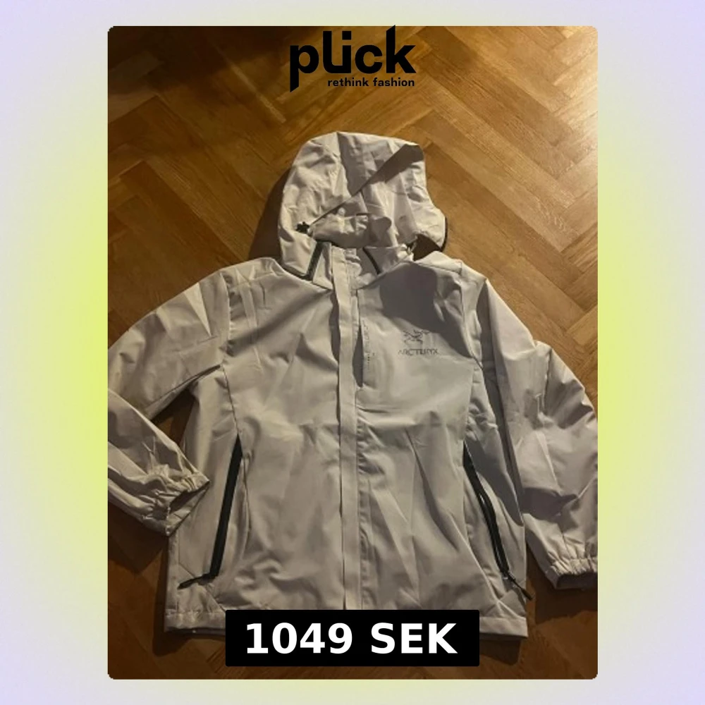 Snygg vit regnjacka från Arc'teryx med huva och svarta dragkedjor. Jackan har stilren design, justerbara ärmslut och två praktiska fickor med dragkedja. Perfekt för blöta dagar och outdoor-äventyr. Logga på bröstet och detaljer på ryggen.