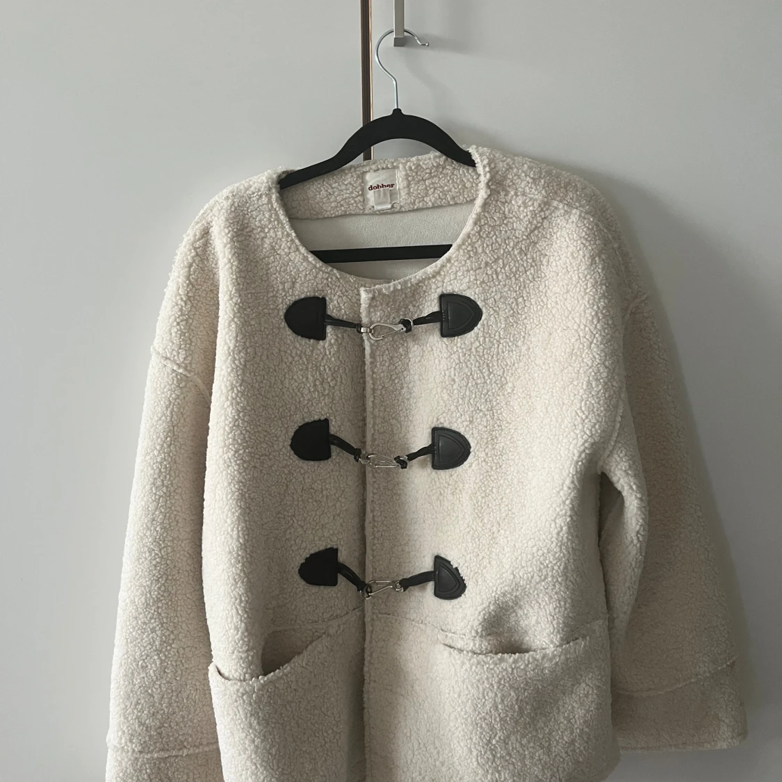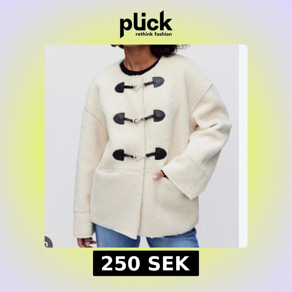 Säljer en oversized vit teddyjacka från dobber med svarta detaljer och tre metallspännen framtill. Jackan har stora fickor, rund halsringning och är tillverkad i mjukt teddy-material. Perfekt för höst- eller vinter.