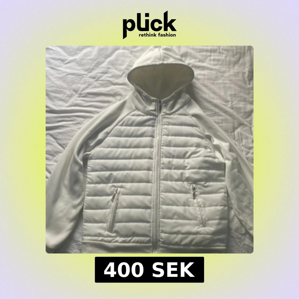 Säljer en stilren vit cardigan med huva och dragkedja framtill. Perfekt för dig som vill ha en clean look och hålla dig varm under hösten och våren💯passar dig som är 175-180cm skulle jag säga👍